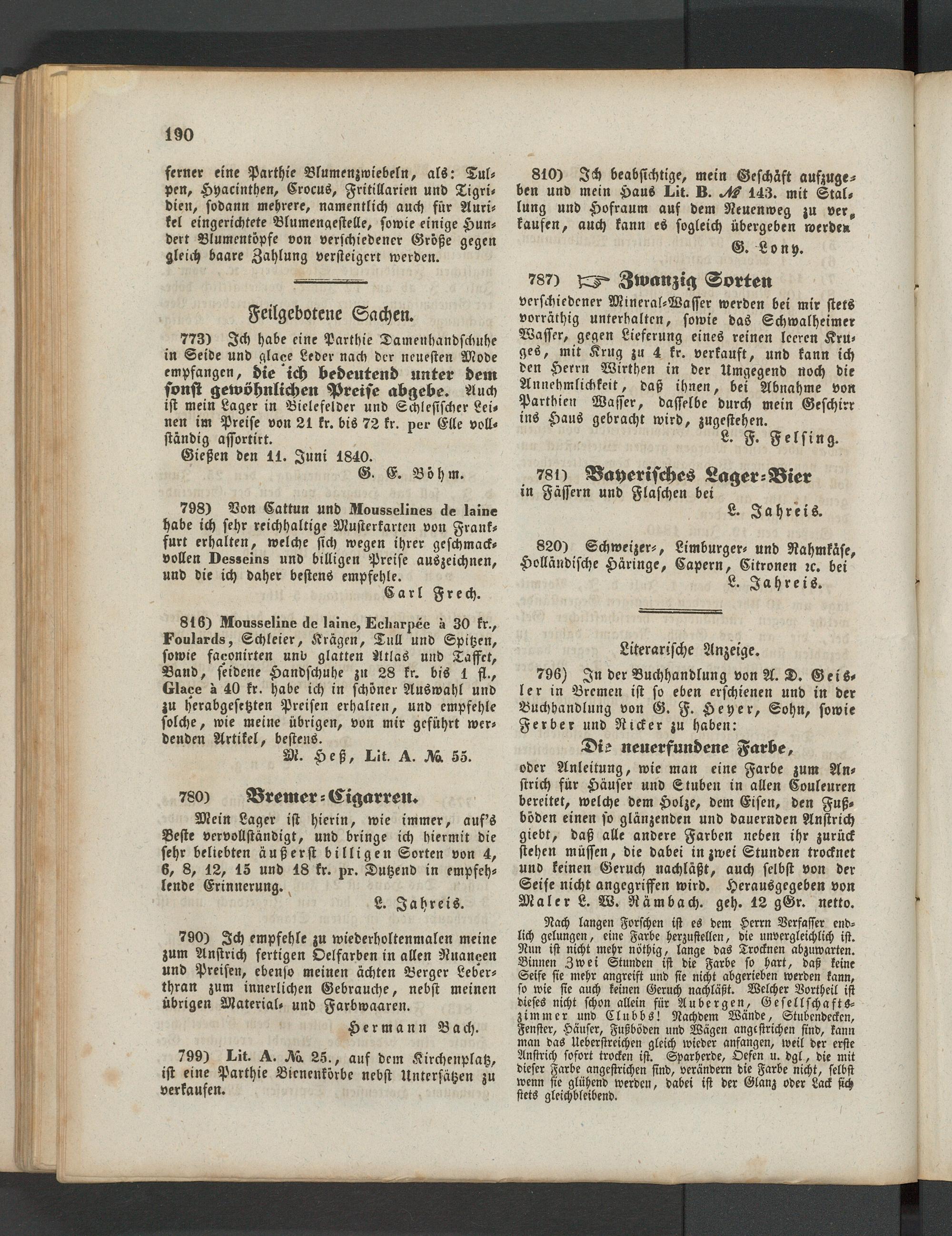 773) Ich habe eine Parthie Damenhandschuhe in Seide und glace Leder nach der neuesten Mode empfangen, die ich bedeutend unter dem sonst gewöhnlichen Preise abgebe. Auch ist mein Lager in Bielefelder und Schlesischer Leinen im Preise von 21 fr. bis 72 fr. per Elle vollständig assortier.