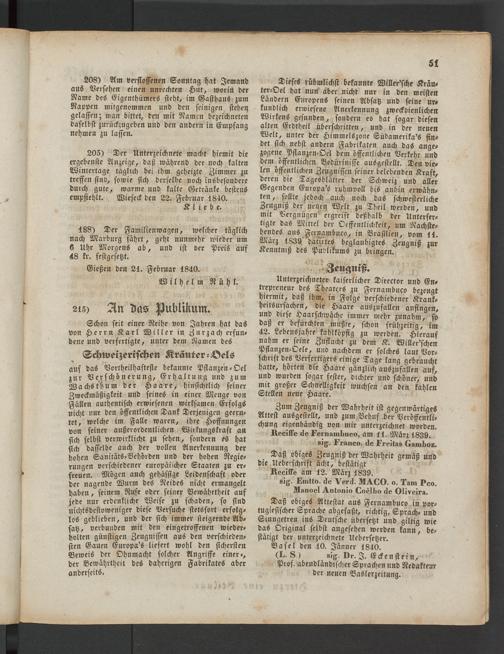 Unterzeichneter kaiserlicher Director und En- trepreneur des Theaters zu Fernambuco bezeugt hiermit, daß ihm, in Folge verschiedener Krankheitsursachen, die Haare auszufallen anfingen, und diese Haarschwäche immer mehr zunahm, so daß er befürchten mußte, schon frühzeitig, im 42. Lebensjahre kahlköpfig zu werden. Hierauf nahm er seine Zuflucht zu dem K. Willer'schen Pflanzen-Oele, und nachdem er solches laut Vorschrift des Verfertigers einige Tage lang gebraucht hatte, hörten die Haare gänzlich auszufallen auf, und wurden sogar fester, dichter und schöner, und mit großer Schnelligkeit wuchsen an den kablen Stellen neue Haare.