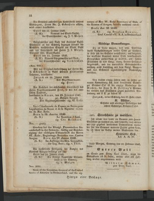 Gesehen bei der Königl, Preussischen Ge- sandschaft in der Schweiz. Gütig zur Bescheinigung der richtigen Unterschrift des Herrn W. Rohr, Regierungs ■ Secretärs vom Canto« Aargau. Bern den 21. Januar 1840.