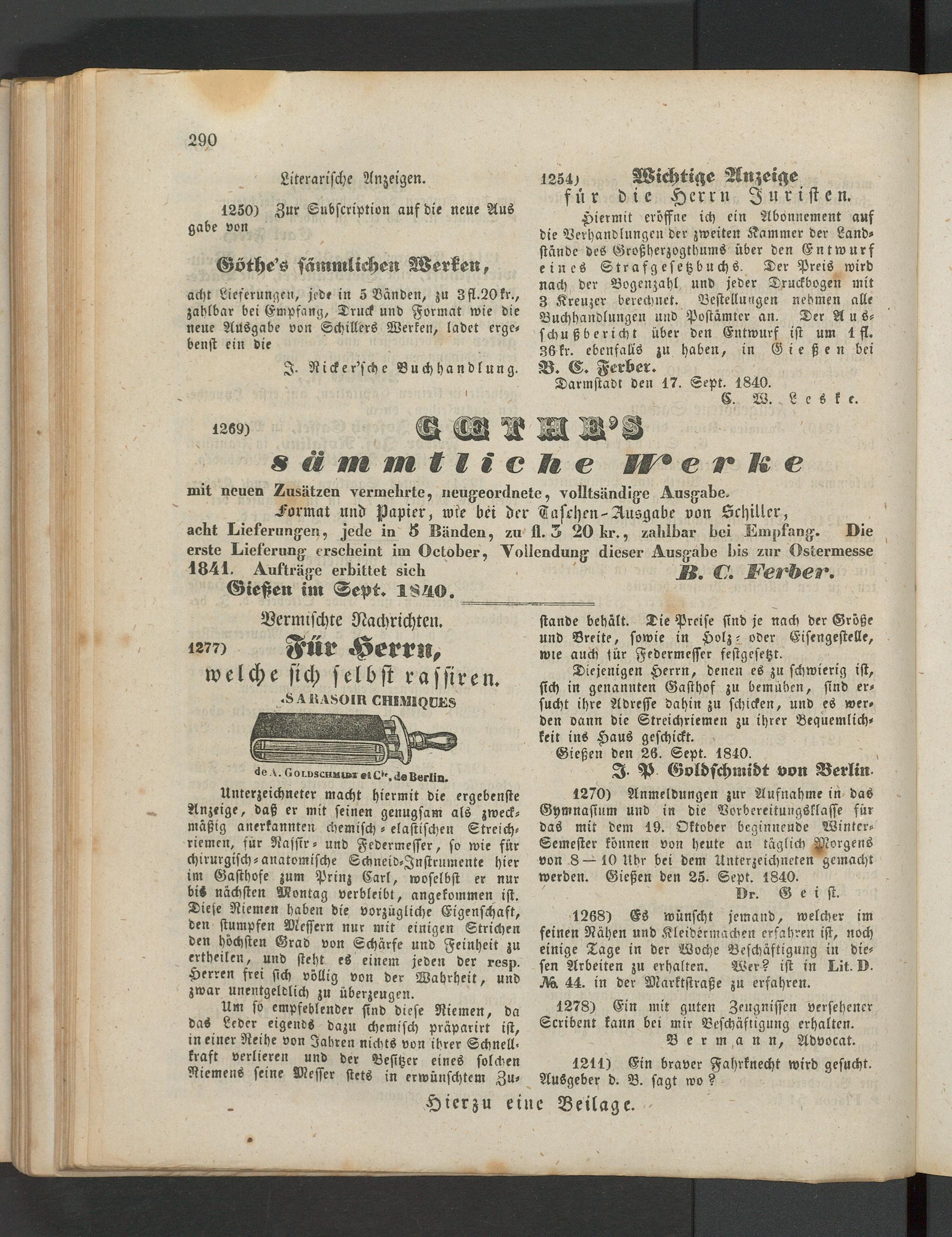 Hiermit eröffne ich ein Abonnement auf die Verhandlungen der zweiten Kammer der Landstände des Großherzogtbums über den Entwurf eines Strafgesetzbuchs. Der Preis wird nach der Bogenzahl und jeder Druckbogen mit 3 Kreuzer berechnet. Bestellungen nehmen alle Buchhandlungen und Postämter an. Der Ausschußbericht über den Entwurf ist um 1 fl. 36fr. ebenfalls zu haben, in Gießen bei B. C. Ferber.