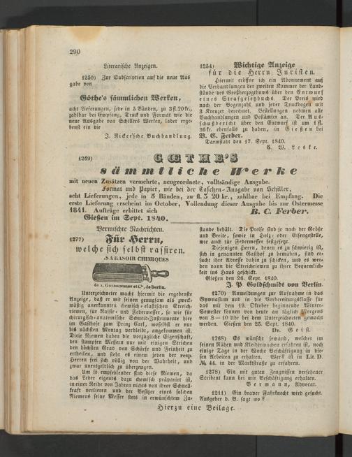 Formal und Papier, wie bei der Tafrhen-Ausgabe von Schiller, acht Lieferungen, jede in 6 Bänden, zu fl. 3 20 kr., zahlbar bei Empfang. Die erste Lieferung erscheint im October, Vollendung dieser Ausgabe bis zur Ostermesse 1841. Aufträge erbittet sich Jg. (O.
