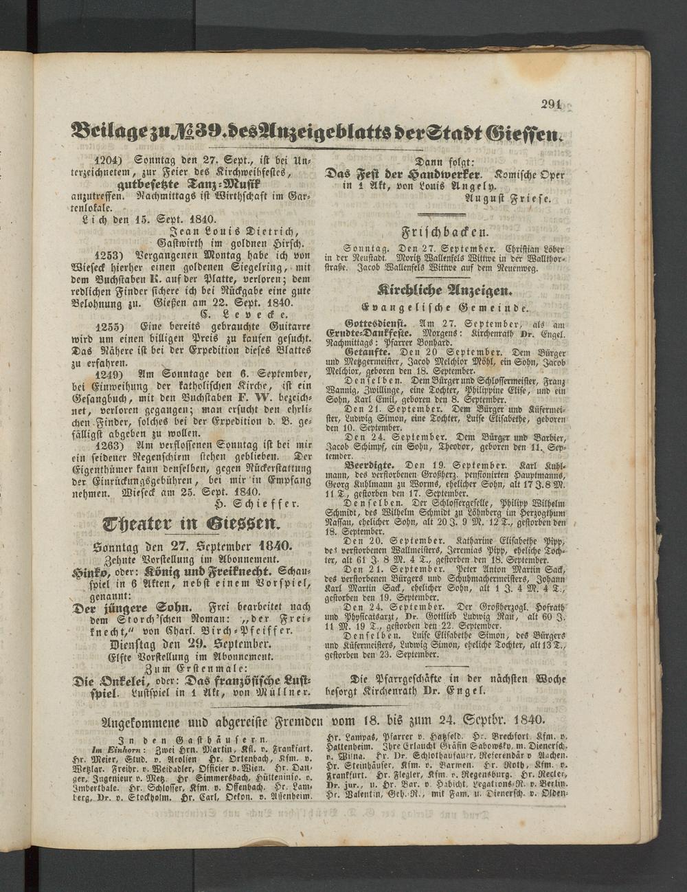 1253) Vergangenen Montag habe ich von Wieseck hierher einen goldenen Siegelring, mit dem Buchstaben D. auf der Platte, verloren; dem redlichen Finder sichere ich bei Rückgabe eine gute Belohnung zu. Gießen am 22. Sept. 1840.