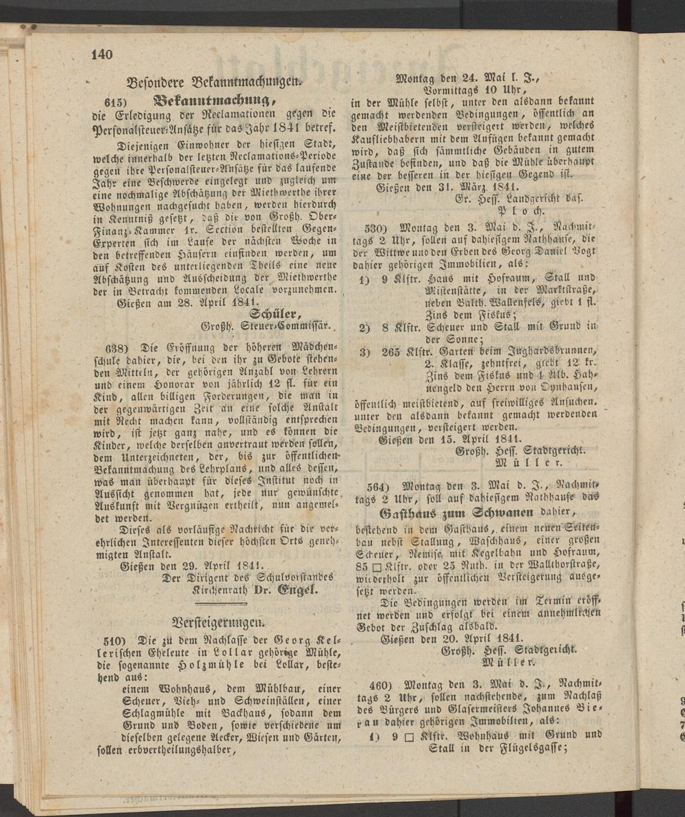 615) Bekanntmachung, die Erledigung Der Reclamationen gegen die Personalsteuer-Ansätze für dasJahr 1841 betres.