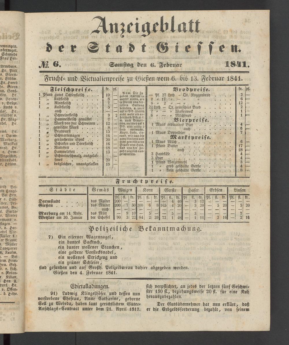 Frucht- und Victualienpreise zu Gießen vom 6. biö 13. Februar 1841.