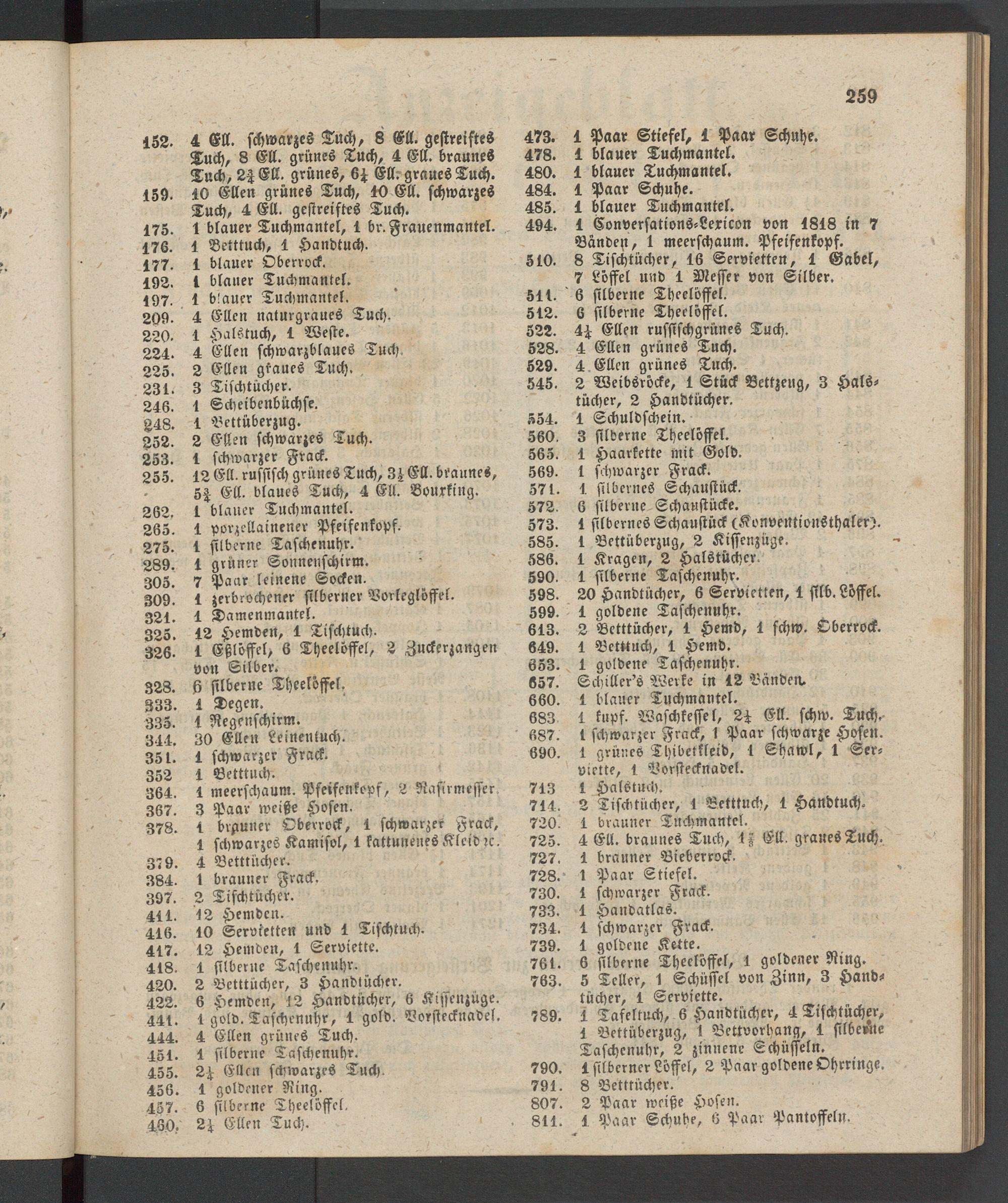 159. 10 Ellen grünes Tuch, 10 Ell. schwarzes Tuch, 4 Ell. gestreiftes Tuch.