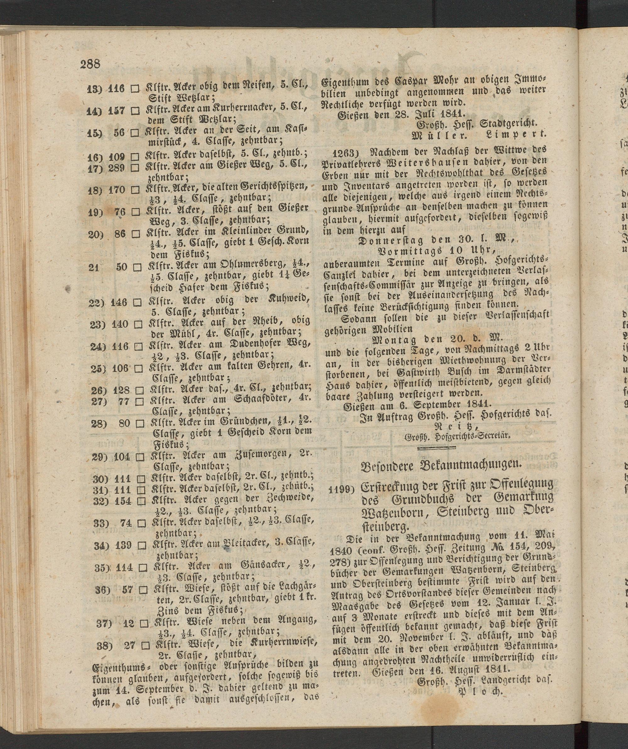 Die in der Bekanntmachung vom 11. Mar 1840 (conf. Großh. Hess. Zeitung M. 154, 209, 278) zur Offenlegung und Berichtigung der GrunL- bücher der Gemarkungen Watzenborn, Steinberg, und Obersteinberg bestimmte Frist wird auf den. Antrag des Ortsvorstandes dieser Gemeinden nach Maasgabc des Gesetzes vom 12. Januar l. I. auf 3 Monate erstreckt und dieses mit dem Anfügen öffentlich bekannt gemacht, daß diese Frist mit dem 20. November l. I. ablauft, und dap alsdann alle in der oben erwähnten Bekanntmachung angedrohten Nachthcile unwiderruflich ciu- treten. Gießen den 16. August 1841. '