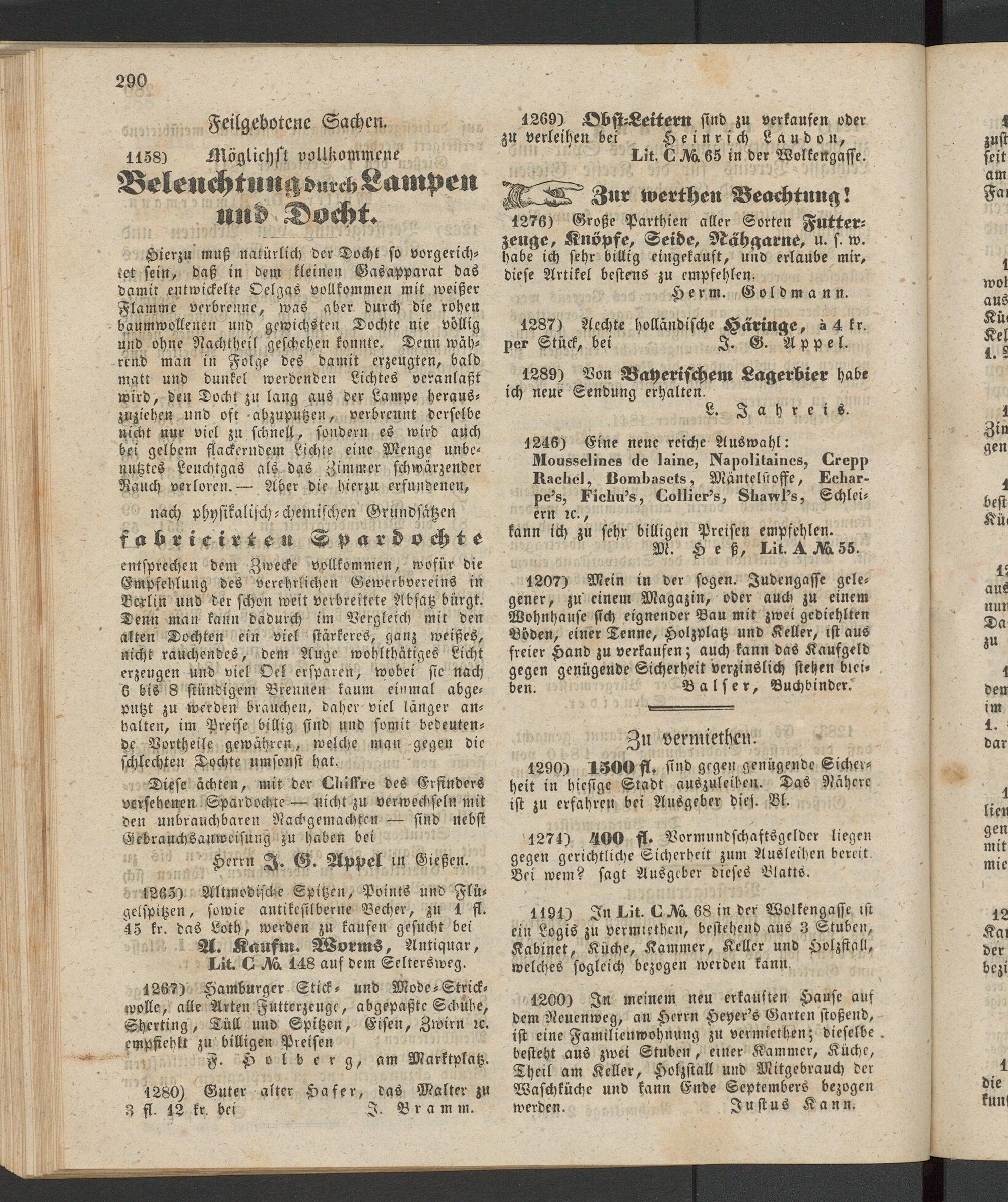 1276) Große Parthien aller Sorten Futterzeuge, Knöpfe, Seide, Nähgarne, u. s. w. habe ich sehr billig cingekauft, und erlaube mir, diese Artikel bestens zu empfehlen.