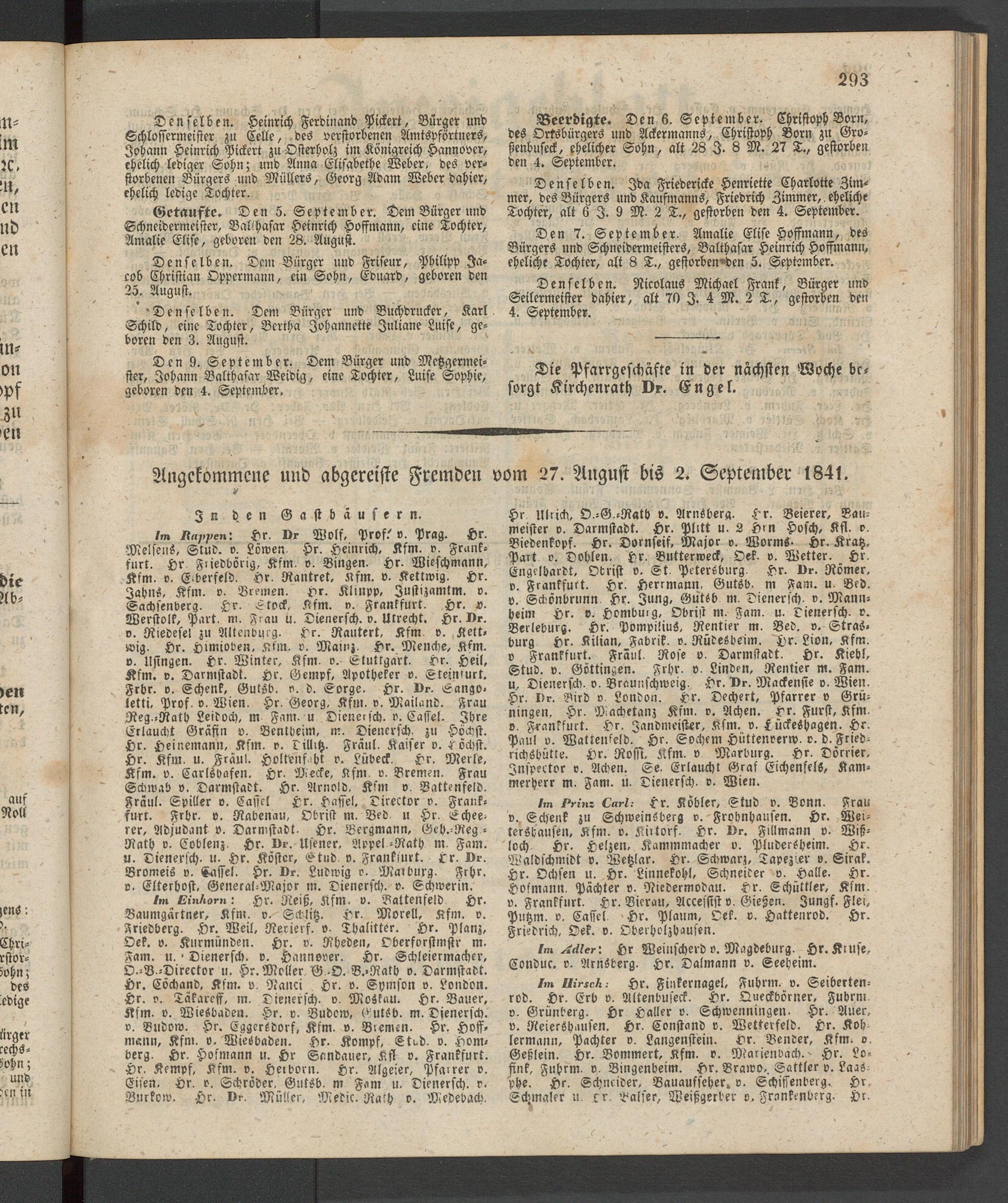 Im Adler: Hr Weiuscherd v. Magdeburg. Hr. Kruse, Conduc. v. Arnsberg. Hr. Dalmann v. Seeheini.