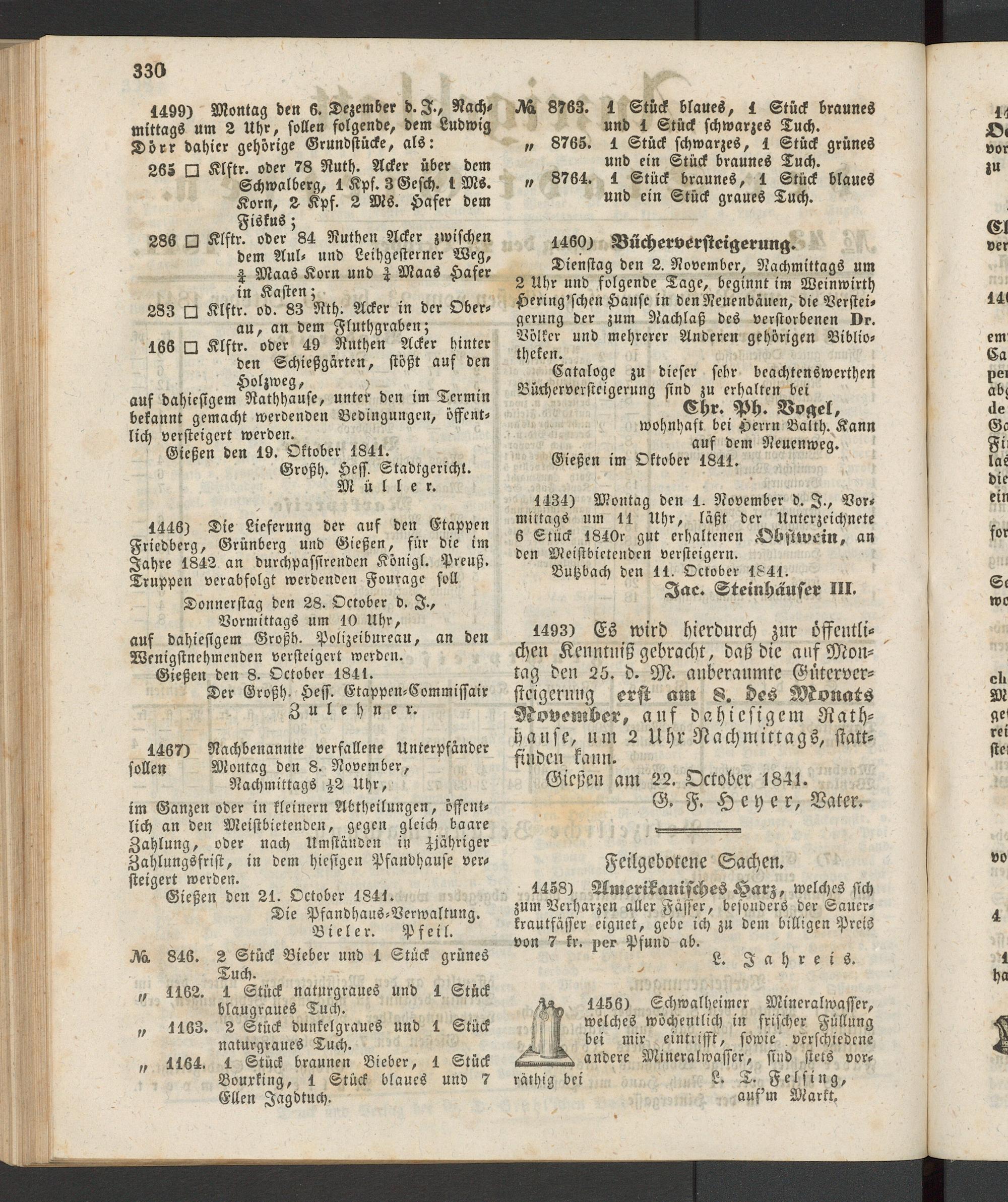 Dienstag den 2. November, Nachmittags um 2 Uhr und folgende Tage, beginnt im Weinwirth Hcring'schen Hanse in den Neuenbäuen, die Versteigerung der zum Nachlaß des verstorbenen Dr. Völker und mehrerer Anderen gehörigen Bibliotheken.