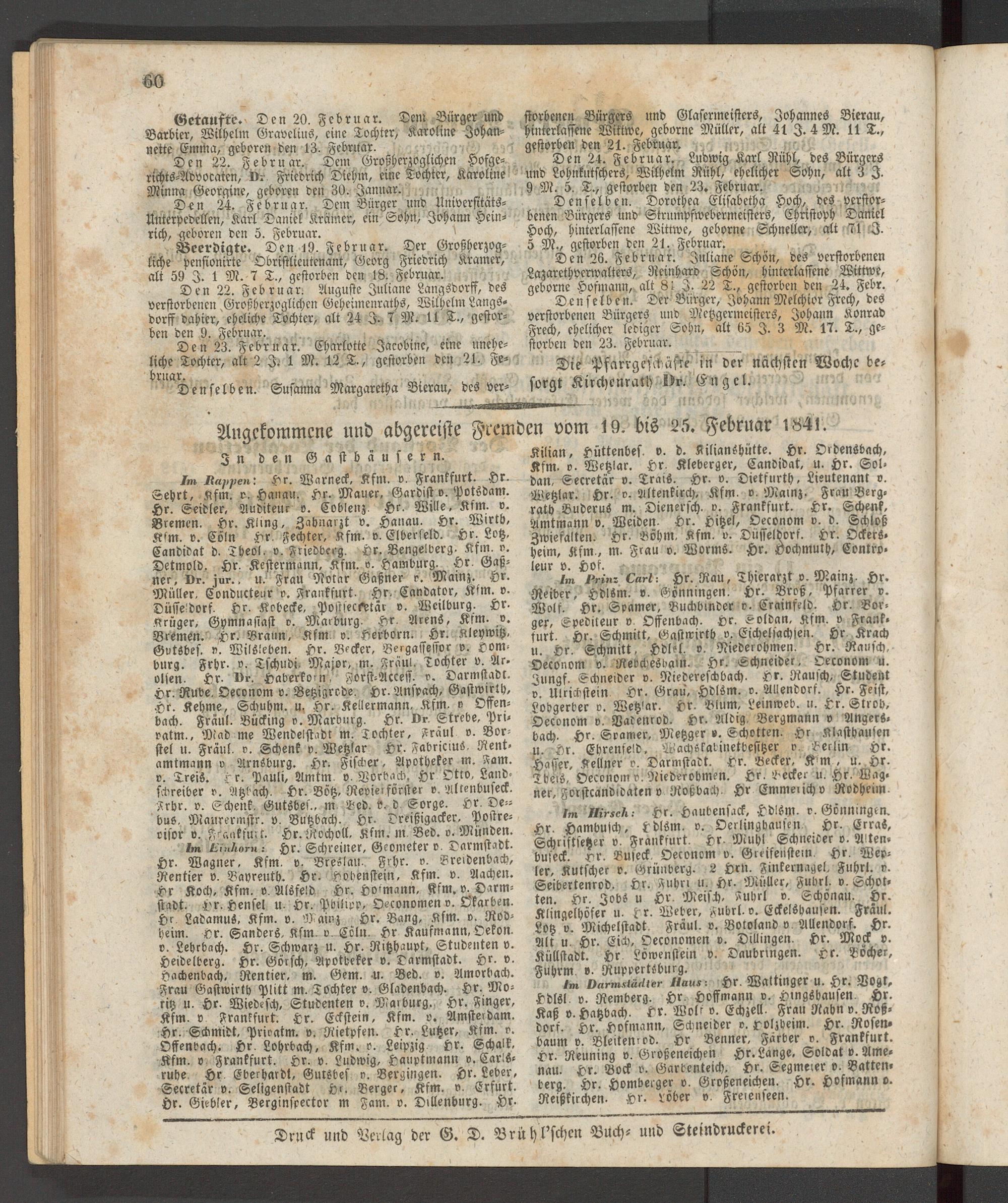Angekommene und abgereiste Fremden vom 19. bis 25. Februar 1841.