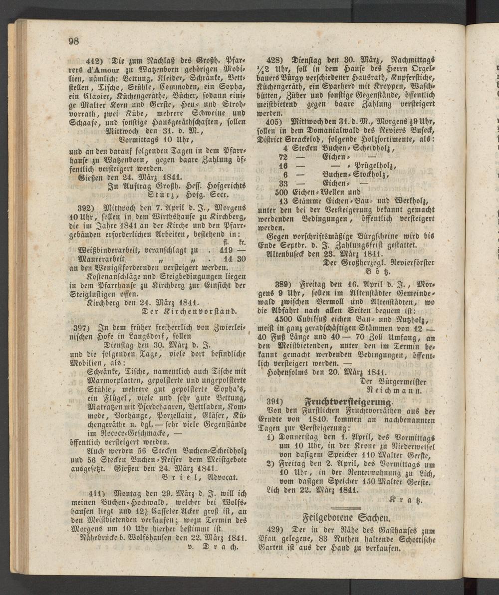Auch werden 56 Stecken Buchen-Scheidholz und 56 Stecken Buchen-Reiser dem Meistgebote ausgesetzt. Gießen den 24. März 1841..