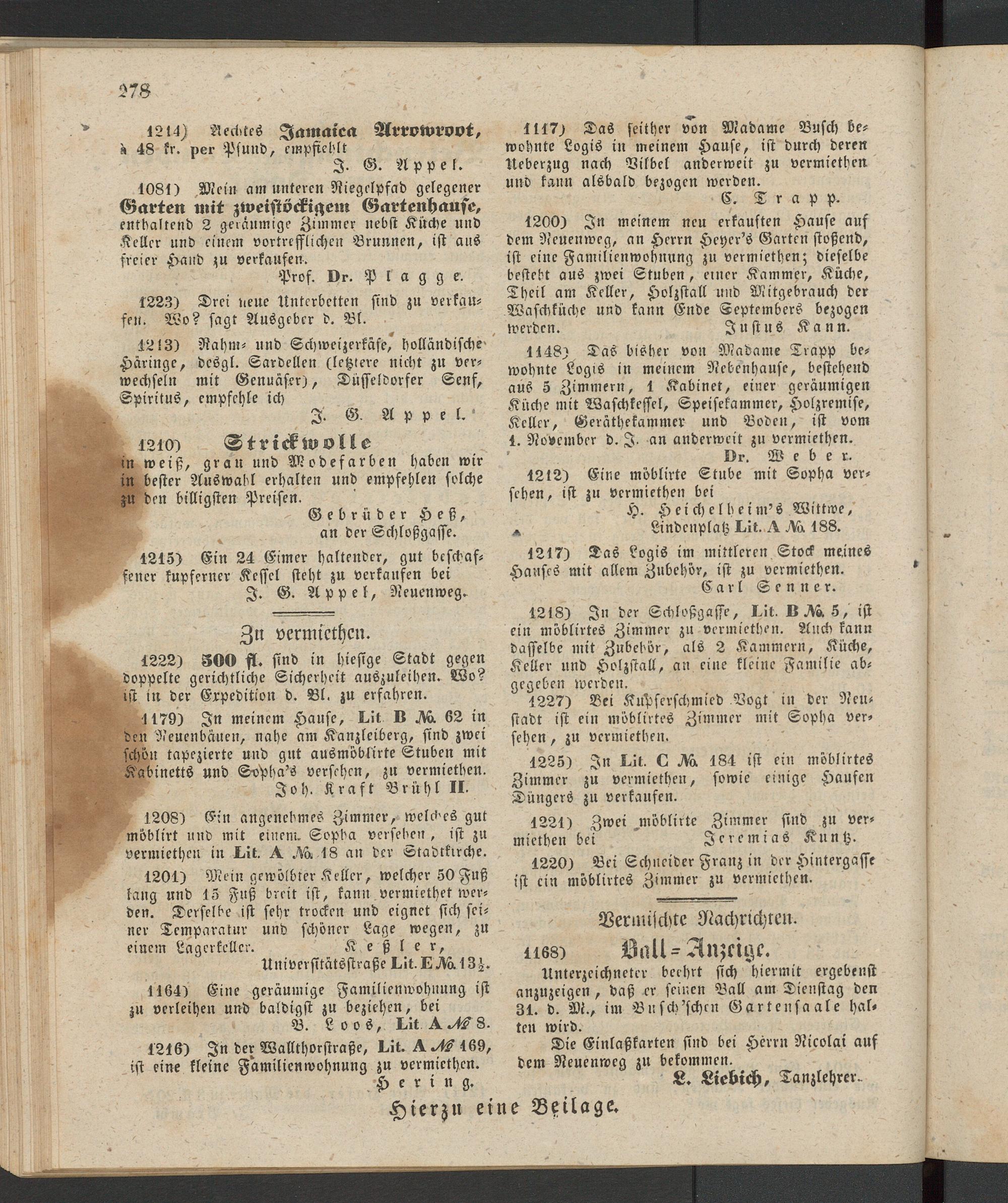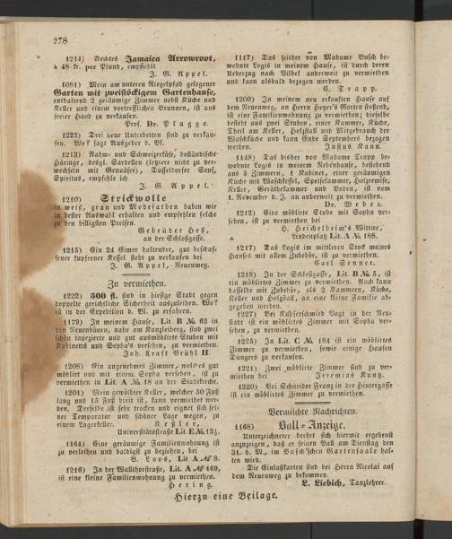 1117) Das seither von Madame Busch bewohnte Logis in meinem Hause, ist durch deren Neberzug nach Bilbel anderweit zu vermicthen und kann alsbald bezogen werden.