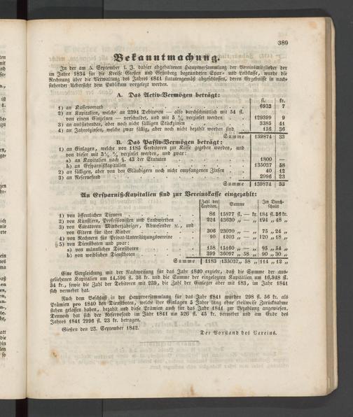 In der am 5. September l. I. dahier abgehaltenen Hauptversammlung der Vereinsmitglieder der im Jahre 1834 für die Kreise Gießen und Grünberg begründeten Spar- und Leibkasse, 'wurde die Rechnung über die Verwaltung des Jahres 4841 statutengemäß abgeschlossen, deren Ergebnisse in nachstehender Ucbersicht dem Publikum vorgelegt werden.