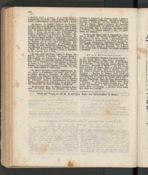 Im Hirsch: Hr. Haller, Hndlsm. v. Schwenningen. Hr. Uhl, Fuhrm. v. Oberschmitten. Hr. Görtz, Fabr. v. Herr. Hr. Restler, Schausp. v. Hartenstein. Hr. Röder, Kaufm' v. Osterode. Hr Schneider, Hndlsm. v. Großhausen. Hr. Breumlich, Buchb. v. Gerau. Hr. Maul, Scrib. v. Schotten. Hr. Finkernagel, Fuhrm. v. Unterseibertenrod. Hr. Happel, Fuhrm. v. Holzhausen. Hr. Schramm u. Hr. Seibert, Fuhrt, von Olpshausen. Hr Linker, Geschstsm. v. Michelbach.