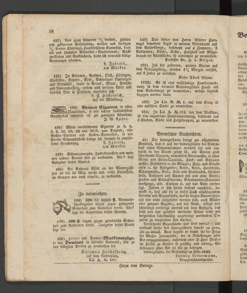 193) In Citronen, Rosinen, Obst, Häringen, Sardellen, Kapern, Senf, Schweitzer- Limburger- und Rahmkäse, sowie in Arrack, Rhum, Punsch- und Limonadeessenz, rothcm und weißem Wein und bairisch Bier in Flaschen, empfiehlt sich