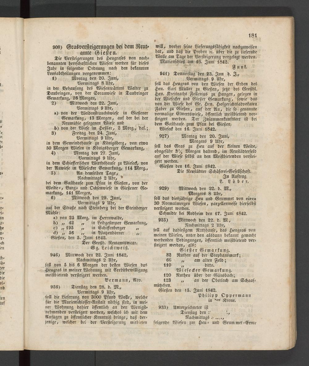 908) Grasversteigerungen bei dem Rent- amte Gießen.