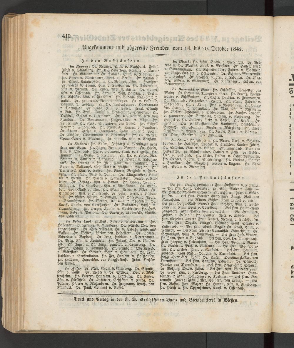 Im Adler-, Hr. Meß, Geom. v. Grünberg. Hr. Schmitt, Kfm. v. Cassel. Hr. Weber u. Hr. Schwarz, Oec. v. Wölfersheim. Hr. Lederer, Handlsin. v. Marburg. Hr. Kaiser, Kfm. v. Hirschfeld. Hr. Kohlheier, Geschstsm. v. Fulda. Hr. Palmer, Pfarrer v. Watzenborn. Hr. Fritzmann, Apoth. von Frankfurt. Hr. Paul, Commis v. Cassel.