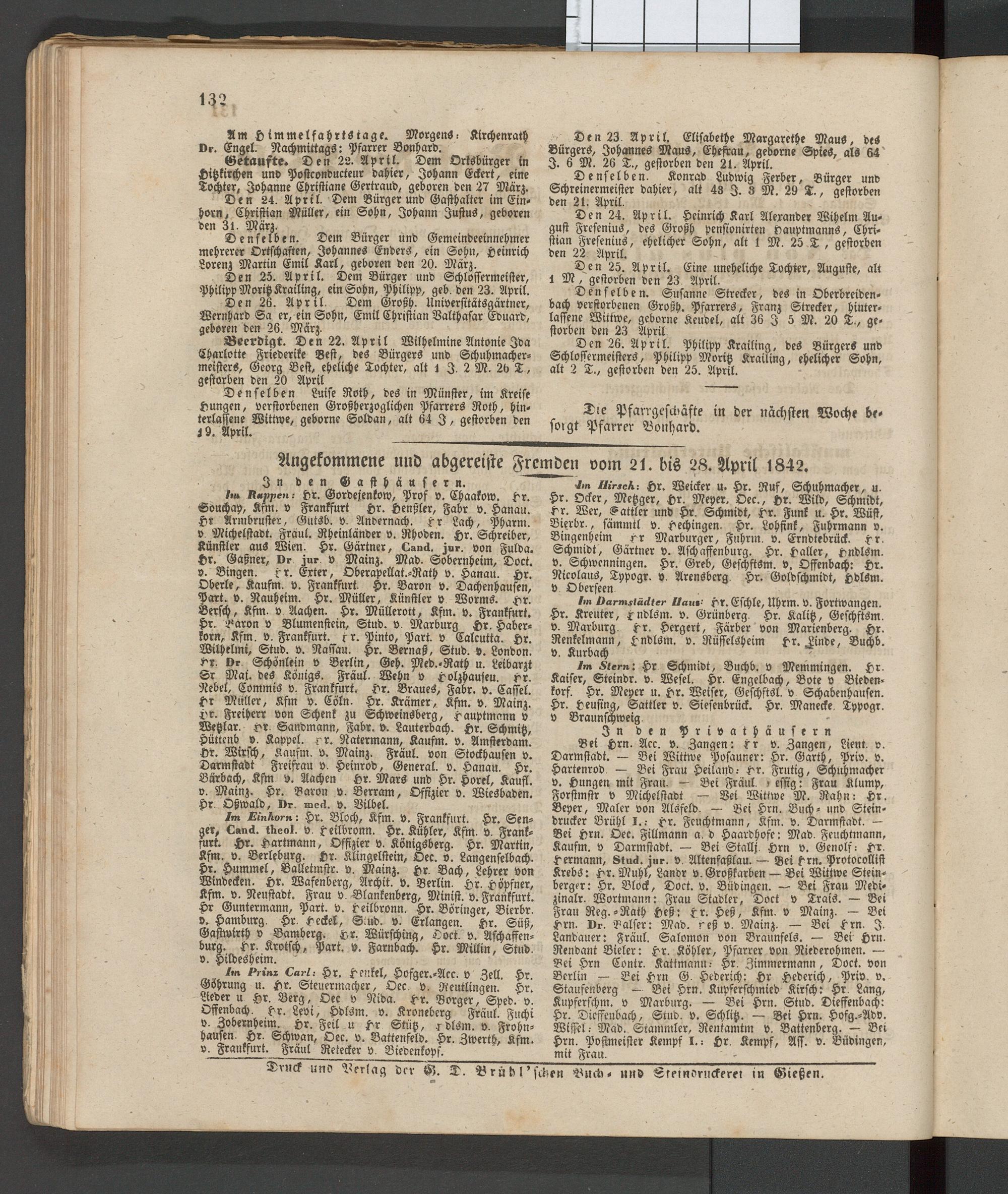 Bei Hrn. Ace. v. Zangen: fr v. Zangen, Liem. v. Darmstadt. — Bei Wittwe Posauner: Hr. Garth, Priv. v. Hartenrod. — Bei Frau Heiland- Hr. Frntig, Schuhmacher v. Hungen mit Fran. — Bei Fräul. i esfig: Frau Klump, Forstmstr v Michelstadt — Bei Wittwe M. Rahn- Hr. Beper, Maler von Alsfeld. — Bei Hrn. Buch- und Stein- drucker Brühl I..- Hr. Fcuchtmann, Kfm. v. Darmstadt. — Bei Hrn. Oec. Fillmann a. d Haardhofe: Mad. Feuchtmann, Kaufm. v Darmstadt. — Bei Stalls. Hrn v. Genolf- Hr. Hermann, Stud. jur. v. Altenfaßlau. — Bei Hrn. Protocollist Krebs: Hr. Muhl, Landr v. Großkarben — Bei Wittwe Steinberger: Hr. Block, Doct. v. Büdingen. — Bei Frau Medi- zinalr. Wortmann: Frau Stadler, Doct v Trais. — Bei Fran Reg.-Rath Heß: fr. Heß, Kfm. v Mainz. — Bei Hrn. Dr. Balser: Mad. reg v. Mainz. — Bei Hrn. I. Landauer: Fräul. Salomon von Braunfels. — Bei Hrn. Rendant Bieler: Hr. Köhler, Pfarrer von Niederohmen. — Bei Hrn Contr. Kattmanu- Hr. Zimmermann, Doct. von Berlin — Bei Hrn G. Hederich: Hr Hederich, Priv. v. Staufenberg — Bei Hrn. Kupferschmied Kirsch: Hr. Lang, Kupferschm. v Marburg. — Bei Hrn. Stud. Dieffenbach: Hr. Dieffenbach, Stud. v. Schlitz. — Bei Hrn. Hofg.-Adv. Wissel.- Mad. Stammler, Rentamtm v. Battenberg. — Bei Hrn. Postmeister Kempf I.: Hr. Kempf, Aff. v. Büdingen, mit Frau.