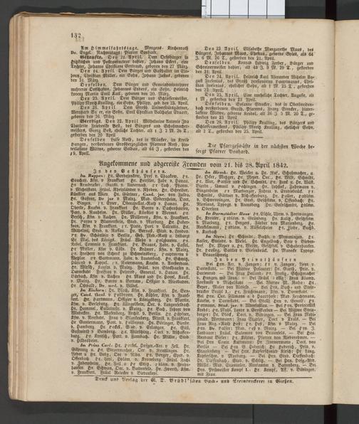 Fremden vom 21. bis 2.8. April 1842.
