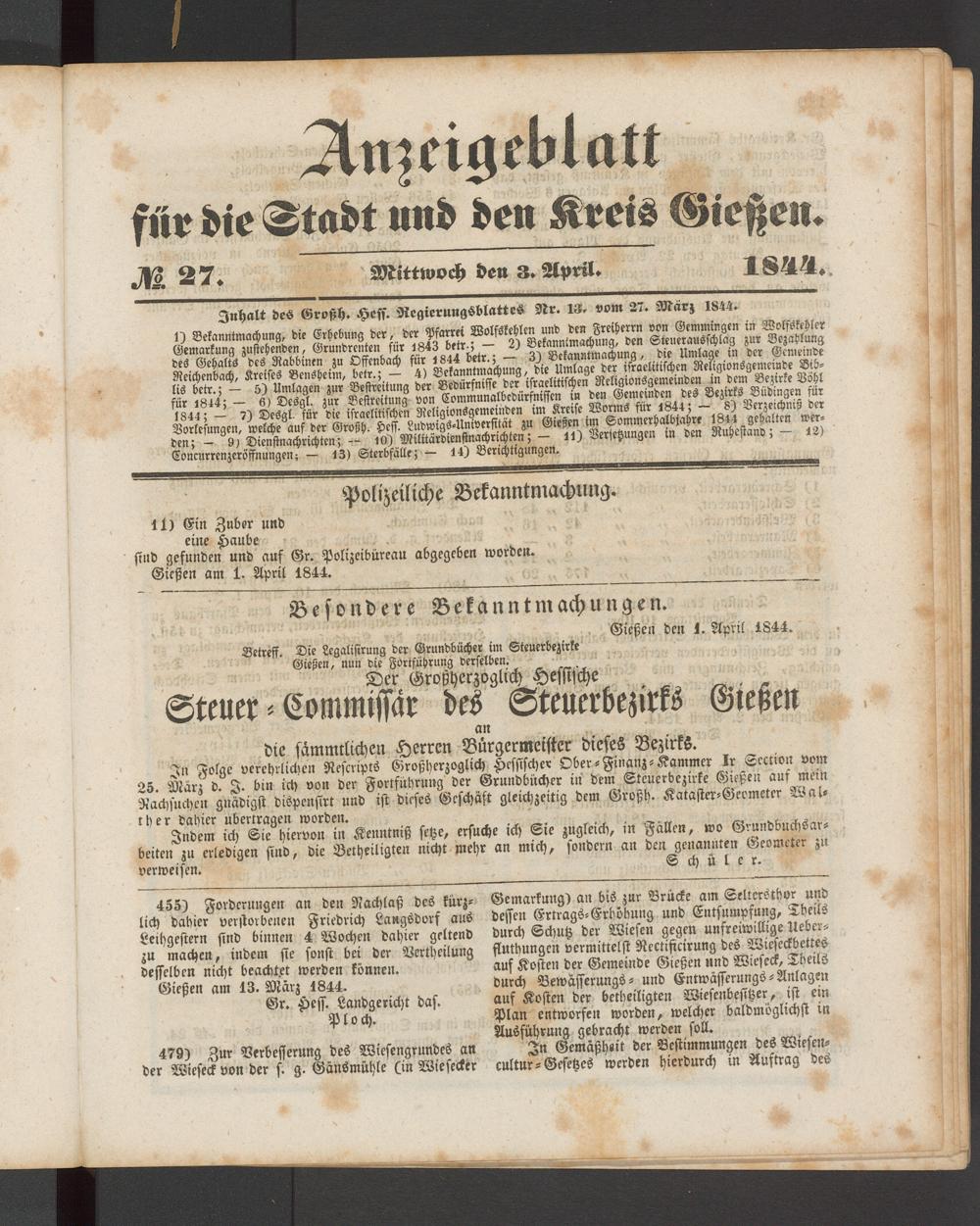 Inhalt des Großh. Hess. Regierungsblattes Nr. 13, vom 27. Marz 1844.
