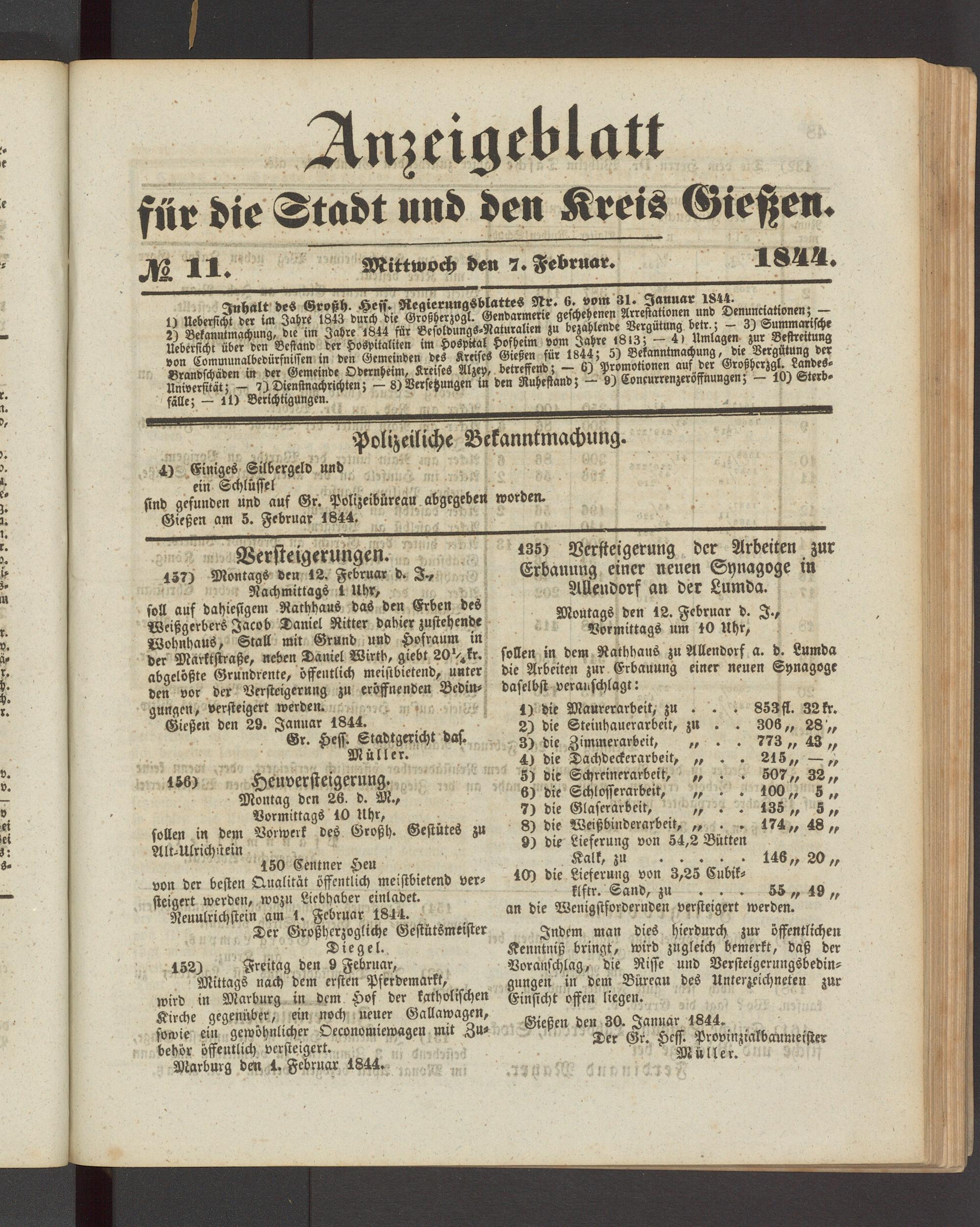 Montags den 12. Februar d. I., Vormittags um 10 Uhr, sollen in dem Rathhaus zu Allendorf a. d. Lumda die Arbeiten zur Erbauung einer neuen Synagoge daselbst veranschlagt: