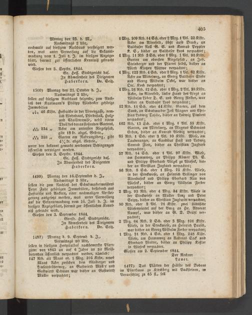 1487) Montag d. 9. Scptemb d. I., Vormittags 10 Uhr, sollen in hiesigem Hoöpitalhof nachbemerkte Pfarr- gnter von 1845 an auf 6 Jahre an die Meistbietenden öffentlich verpachtet werden, nämlich: 147 RtK. alt Maas od. 1 Mrg. 595 Klstr. neues