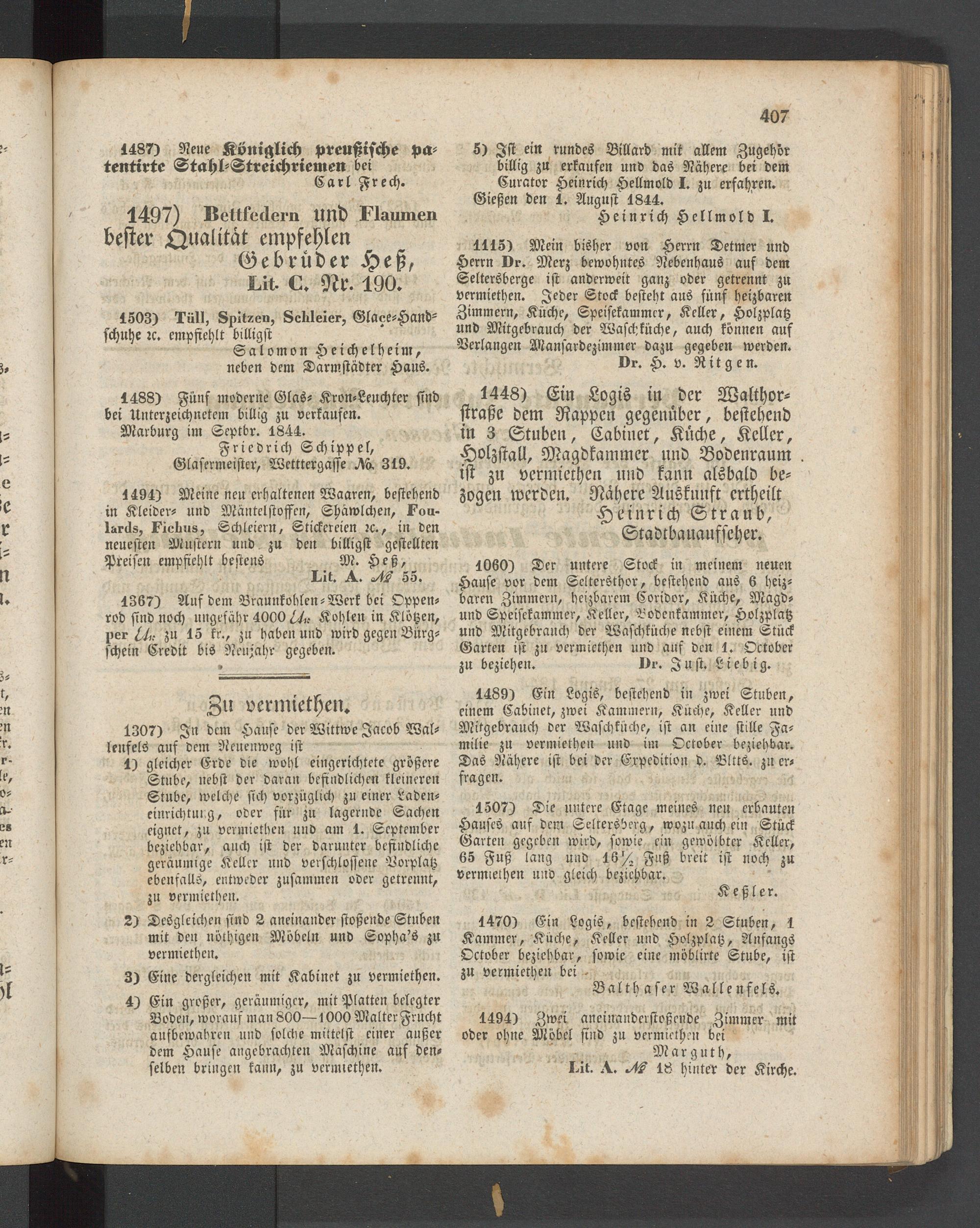 1115) Mein bisher von Herrn Detmer und Herrn Dr. Merz bewohntes Nebenhaus auf dem Seltersberge ist anderweit ganz oder getrennt zu vermiethen. Zeder Stock bestellt aus fünf heizbaren Zimmern, Küche, Speisekammer, Keller, Holzplatz und Mitgcbrauch der Waschküche, auch können auf Verlangen Mansardezimmer dazu gegeben werden.