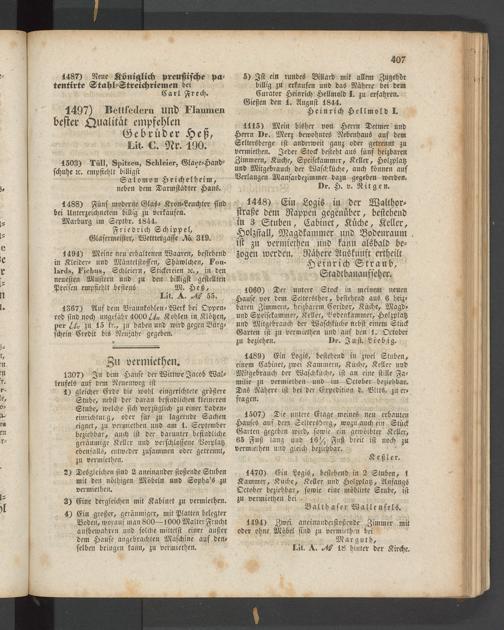 1507) Die untere Etage meines neu erbauten Hauses auf dem Seltersberg, wozu auch ein Stück Garten gegeben wird, sowie ein gewölbter Keller, 65 Fuß lang und 16% Fuß breit ist noch zu vermiethen und gleich beziehbar.