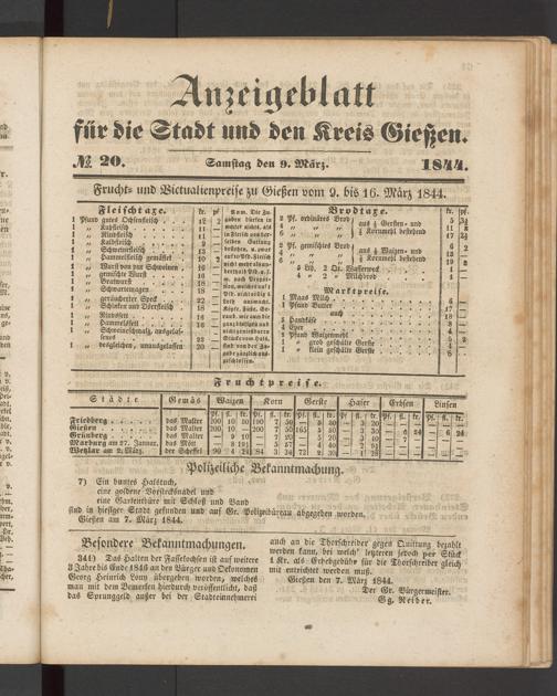 Frucht- und Victualienpreise zu Gießen vom 9. biö 16. Marz 1844.
