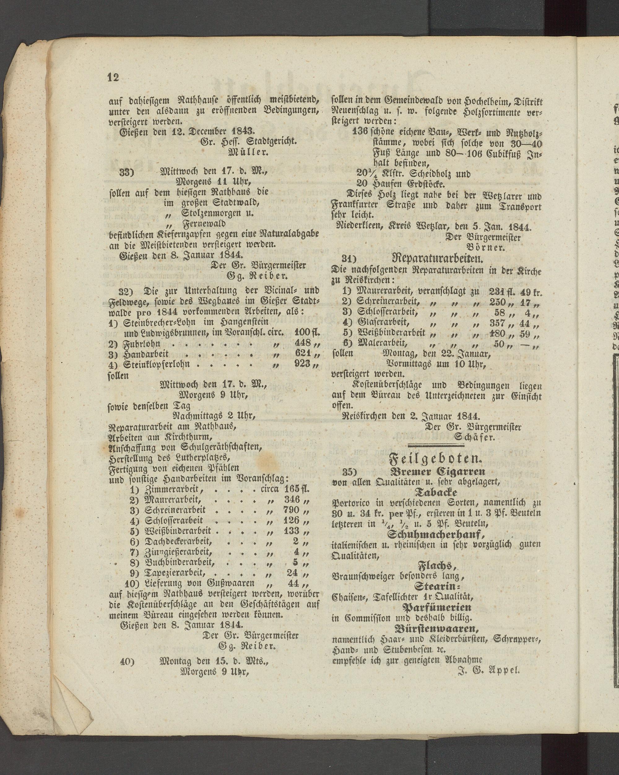 32) Die zur Unterhaltung der Vicinal- und Feldwege, sowie des Wegbaues im Gießer Stadtwalde pro 1844 verkommenden Arbeiten, als: