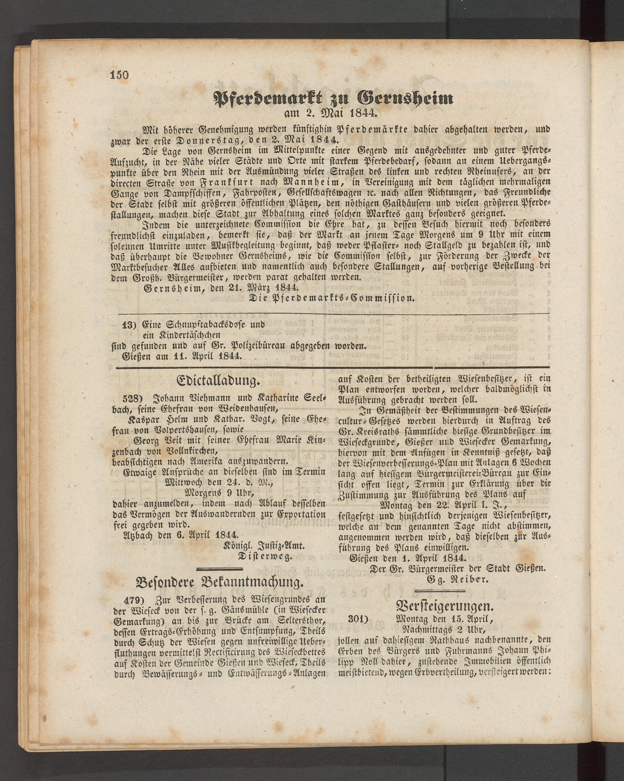 Mit höherer Genehmigung werden künftighin Pferdemärkte dahier abgehalten werden, und zwar der erste Donnerstag, den 2. Mai 1844.