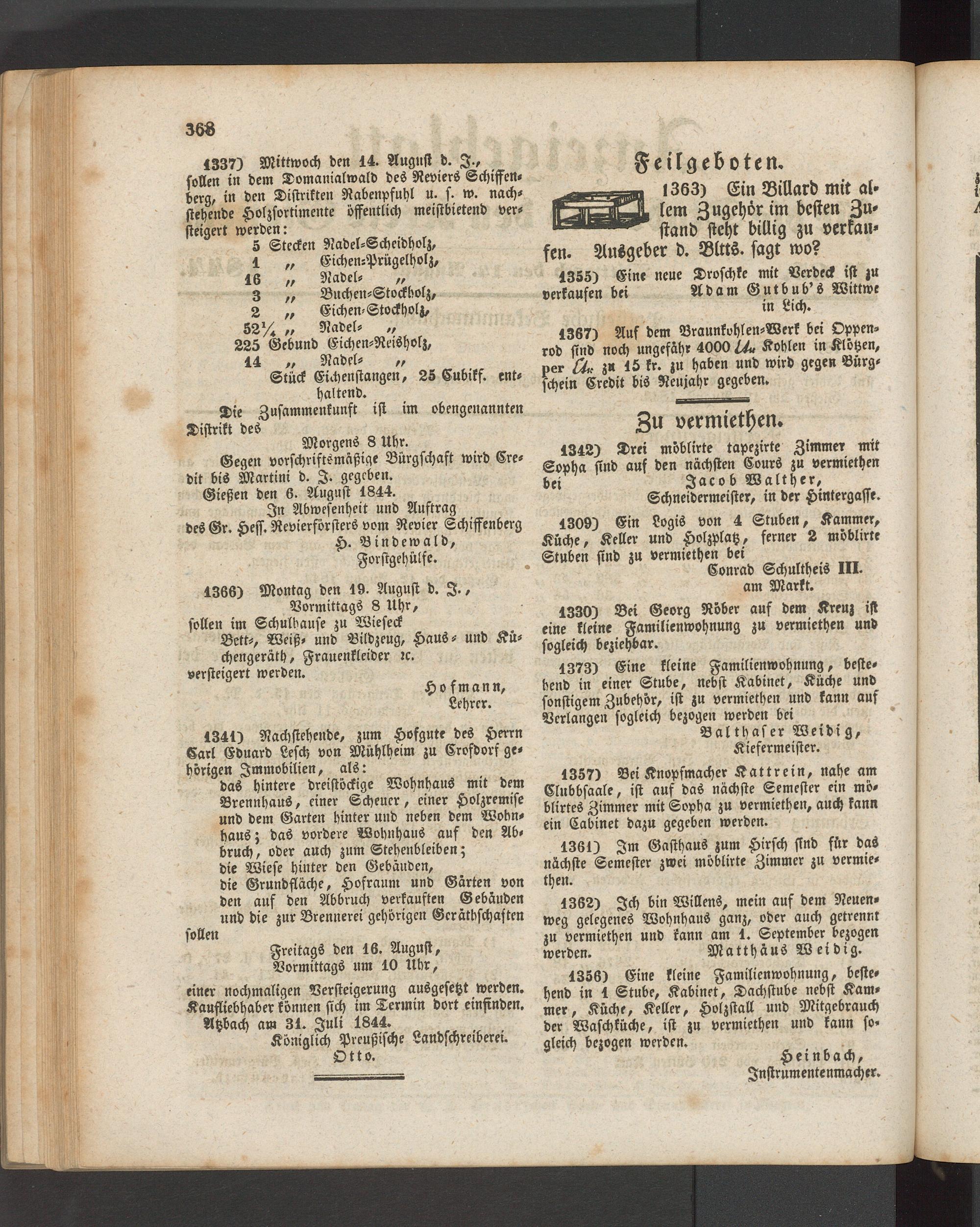 1366) Montag den 19. August d. I., Vormittags 8 Uhr, sollen im Schulbause zu Wieseck