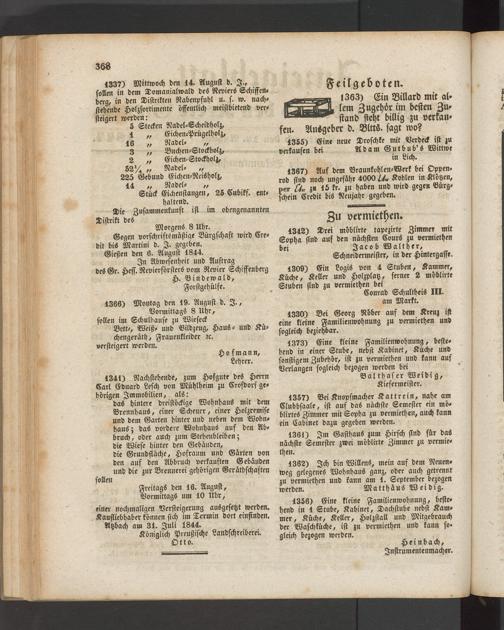 Freitags den 16. August, Vormittags um 10 Uhr, einer nochmaligen Versteigerung ausgesetzt werden. Kaufliebhaber können sich im Termin dort einfinden.