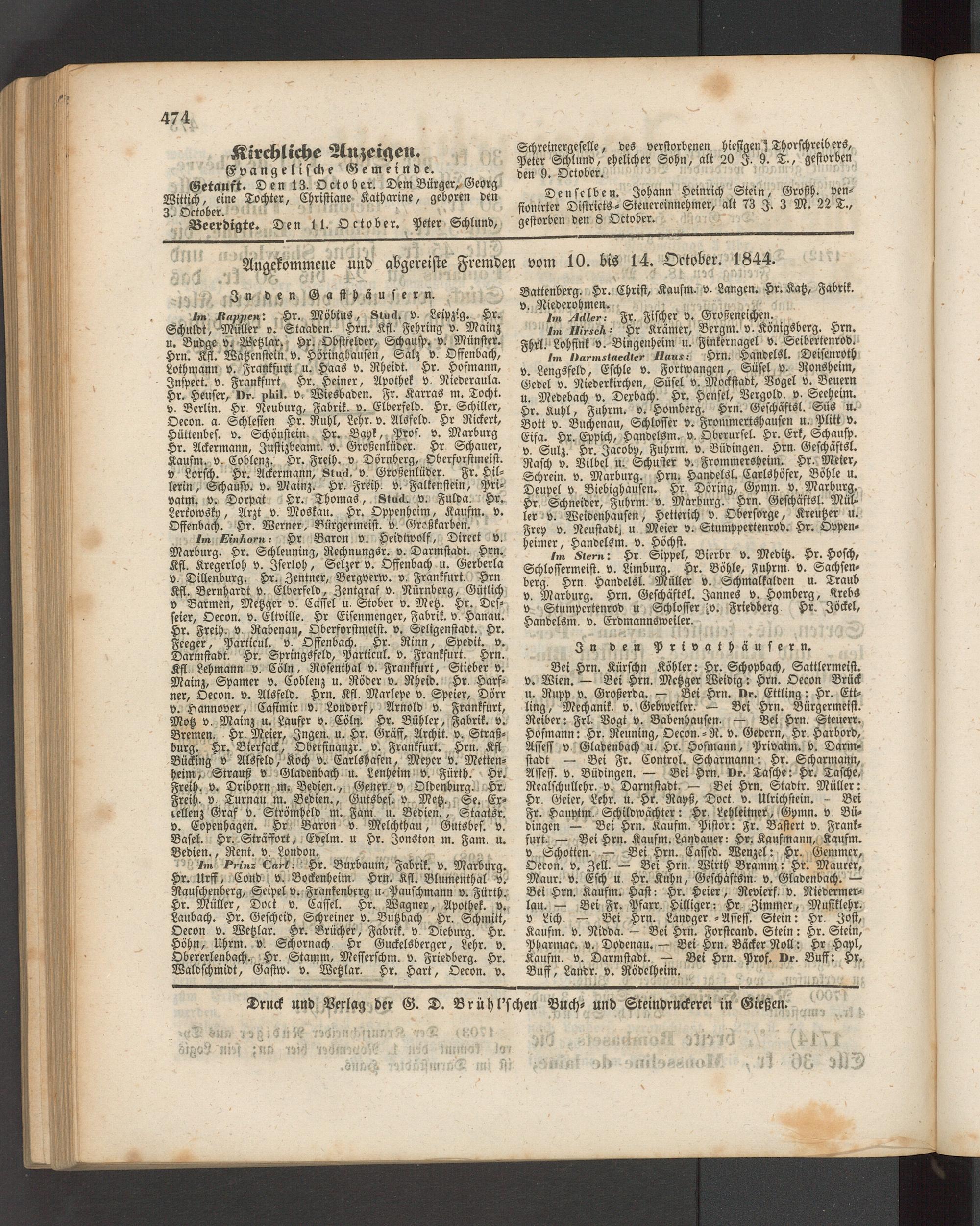 Bei Hrn. Kürschn Köhler: Hr. Schopbach, Sattlermeist. v. Wien. — Bei Hrn. Metzger Weidig: Hrn. Oecon Brück u. Rupp v. Großerda. — Bei Hrn. Dr. Ettling: Hr. Ettling, Mechanik, v. Gebweiler. — Bei Hrn. Bürgermeist. Reiber: Frl. Bogt v. Babenhausen. — Bei Hrn. Steucrr. Hofmann: Hr. Reuning, Oecon.-R. v. Gedern, Hr. Harbord, Affeff v. Gladenbach u. Hr. Hofmann, Privatm. v. Darmstadt — Bei Fr. Control. Scharmann: Hr. Scharmann, Assess. v. Büdingen. — Bei Hrn. Dr. Tasche: Hr. Tasche, Rcalschullehr. v. Darmstadt. — Bei Hrn. Stadtr. Müller: Hr. Geier, Lehr. u. Hr. Rapß, Doct. v. Ulrichstein. - Bei Fr. Hauptm. Schildwächter: Hr. Lehlettner, Gpmn. v Büdingen — Bei Hrn. Kaufm. Pistor: Fr. Basiert v. Frankfurt. — Bei Hrn. Kaufm. Landauer: Hr. Kaufmann, Kaufm. v Schotten. — Bei Hrn. Caffed. Wenzel: Hr. Gemmer, Oecon. v. Zell. — Bei Hrn. Wirth Bramm: Hr. Maurer, Maur. v. Esch u. Hr. Kuhn, Geschäftsm. v. Gladenbach. — Bei Hrn. Kaufm. Hast: Hr. Heier, Reviers v. Nicdermcr- lau. — Bei Fr. Pfarr. Hilliger: Hr. Zimmer, Musiklehr. v Lich. — Bei Hrn. Landger. - Affeff. Stein: Hr. Jost, Kaufm. v. Nidda. — Bei Hrn. Forstcand. Stein: Hr. Stein, Pharmac. v. Dodenau. — Bei Hrn. Bäcker Noll: Hr Hapl, Kaufm. v. Darmstadt. — Bei Hrn. Prof. Dr. Buff: Hr. Buff, Landr. v. Rödelheim.