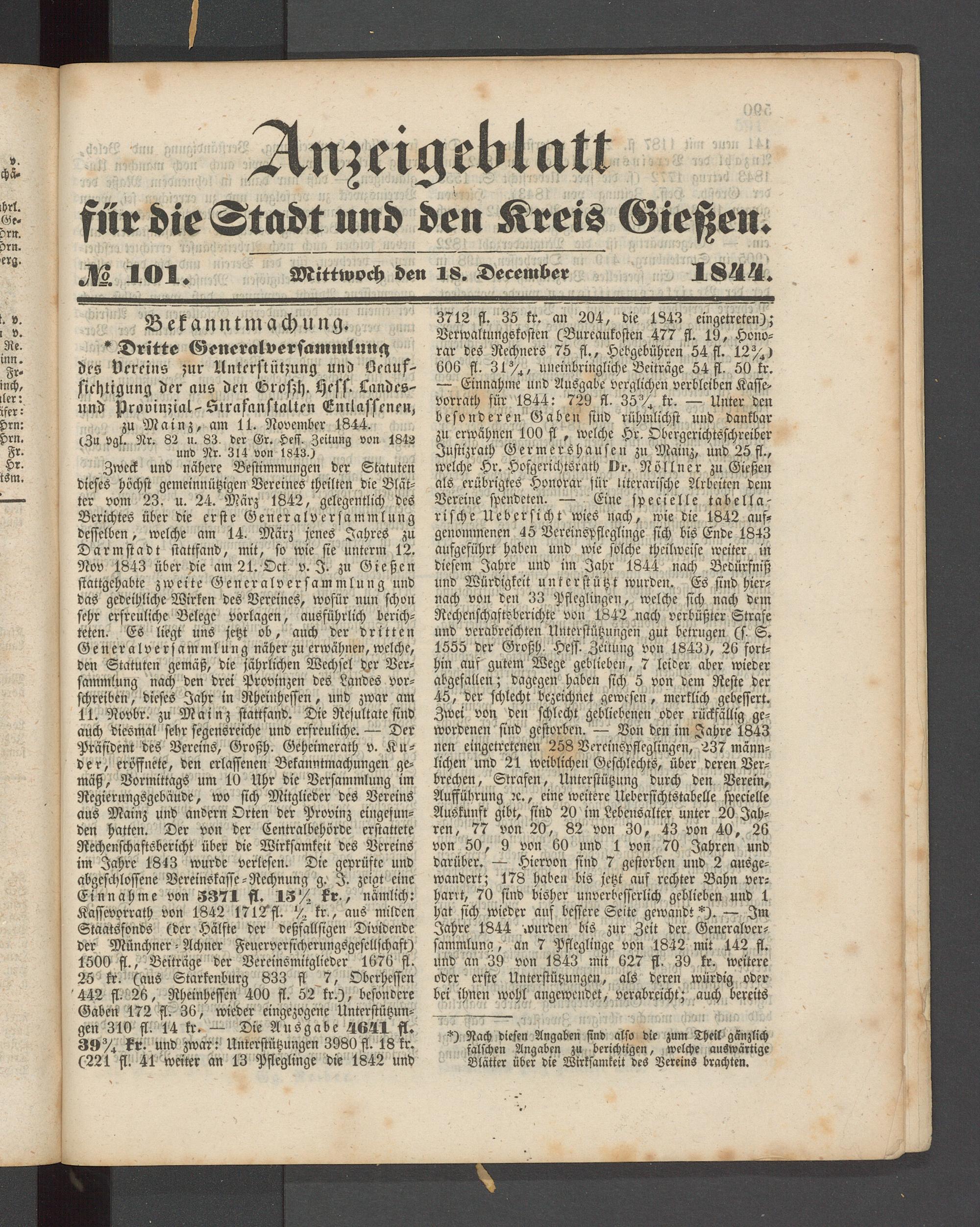 Zweck und nähere Bestimmungen der Statuten dieses höchst gemeinnützigen Vereines theilten die Blätter vom 23. u. 24. März 1842, gelegentlich des Berichtes über die erste Generalversammlung desselben, welche am 14. März jenes Jahres zu Darmstadt stattfand, mit, so wie sie unterin 12. Nov 1843 über die am 21. Oct v. I. zu Gießen stattgehabte zweite Generalversammlung und das gedeihliche Wirken des Vereines, wofür nun schon sehr erfreuliche Belege vorlagen, ausführlich berichteten. Es liegt uns jetzt ob, auch der dritten Generalversammlung näher zu erwähnen, welche, den Statuten gemäß, die jährlichen Wechsel der Versammlung nach den drei Provinzen des Landes vorschreiben , dieses Jahr in Rheinhessen, und zwar am 11. Rovbr. zu Mainz stattfand. Die Resultate sind auch diesmal sebr segensreiche und erfreuliche. — Der Präsident des Vereins, Großh. Geheimerath v. Kuder, eröffnete, den erlassenen Bekanntmachungen gemäß, Vormittags um 10 Uhr die Versammlung im Regierungsgebäude, wo sich Mitglieder des Vereins aus Mainz und andern Orten der Provinz eingefunden hatten. Der von der Centralbehörde erstattete Rechenschaftsbericht über die Wirksamkeit des Vereins im Jahre 1843 wurde verlesen. Die geprüfte und abgeschlossene Vereinskasse-Rechnung g. I. zeigt eine Einnahme von 3371 fl. 13% kr, nämlich: Kasscvorrath von 1842 1712*fl. % kr., aus milden Staatsfonds (der Hälfte der deßfallsigen Dividende der Münchner - Achner Feuerversicherungsgescllschaft) 1500 ft., Beiträge der Vereinsmitglieder 1676 ft. 25 kr. (aus Starkenburg 833 fl 7, Oberhessen 442 fl. 26, Rheinhessen 400 fl. 52 fr.), besondere Gaben 172 fl. 36, wieder eingezogene Unterstützungen 310 fl. 14 kr. — Die Ausgabe 4641 ft. 39%. kr. und zwar: Unterstützungen 3980 fl. 18 kr. (221 fl. 41 weiter an 13 Pfleglinge die 1842 und