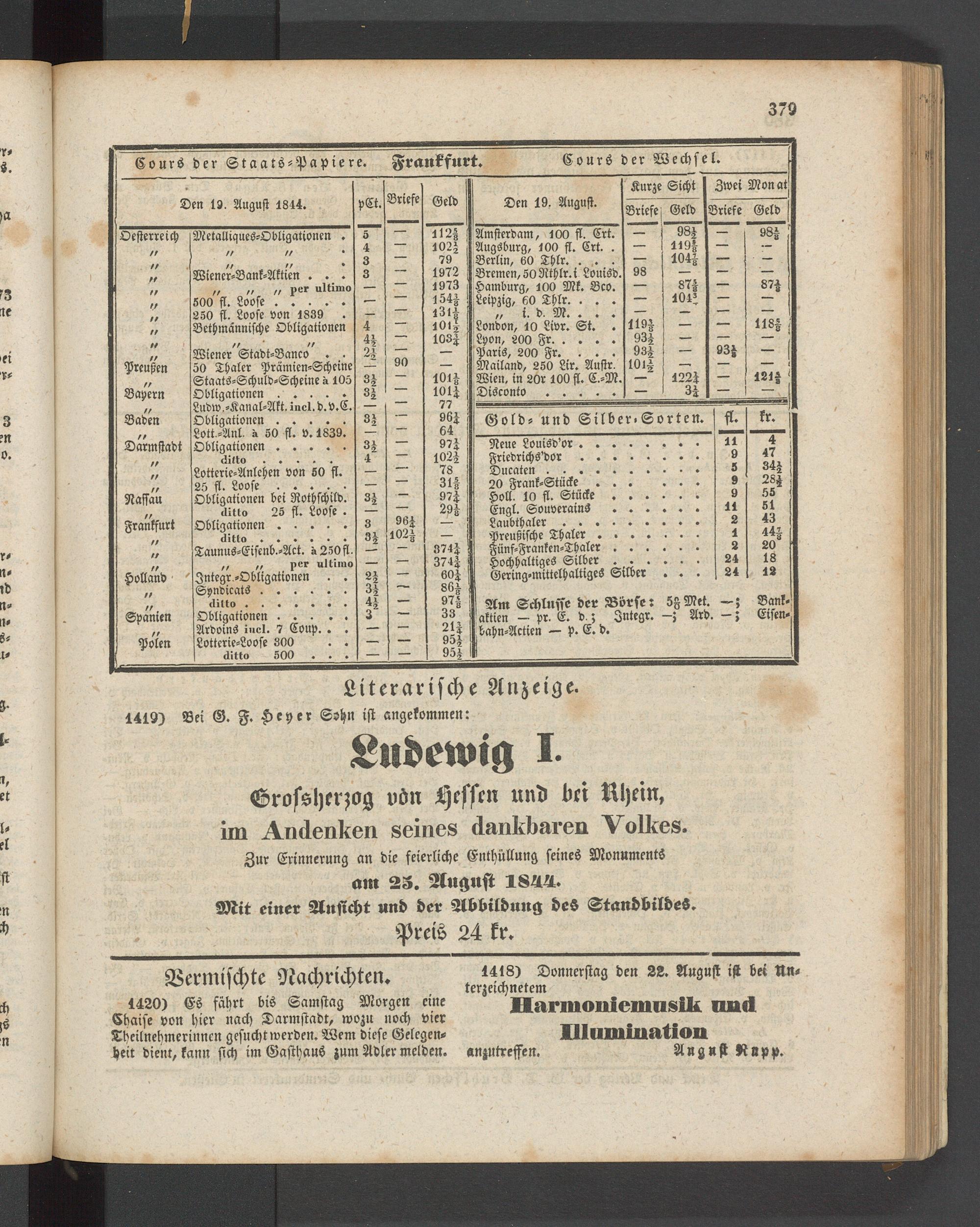 Cours der Staats-Papiere. Frankfurt. Cours der Wechsel.______