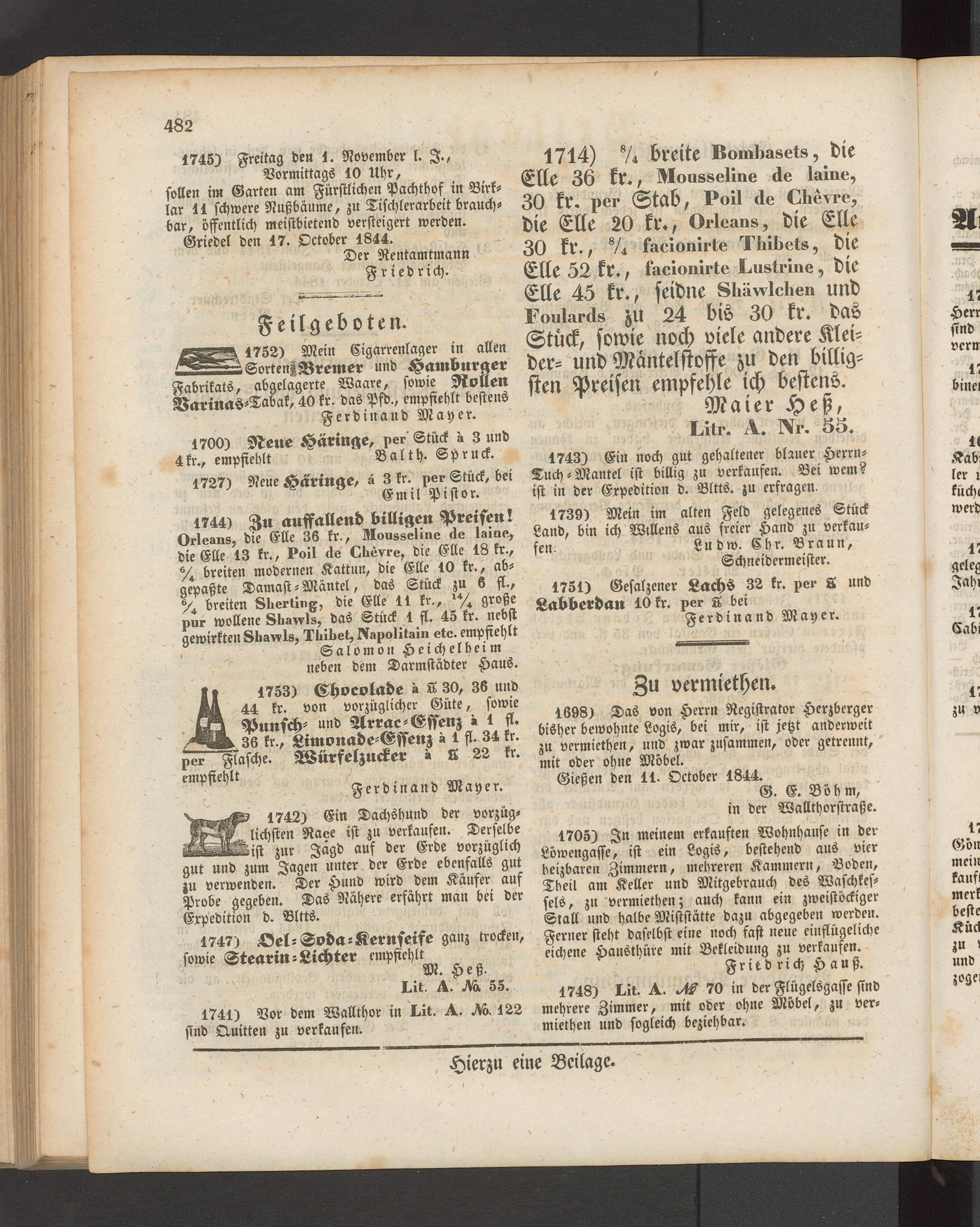 1752) Mein Cigarrenlager in allen Sorte«!Bremer und Hamburger Fabrikats, abgelagerte Waare, sowie Rollen Barinas-Tabak,40kr. das Pfd., empfiehlt bestens Ferdinand Mayer.