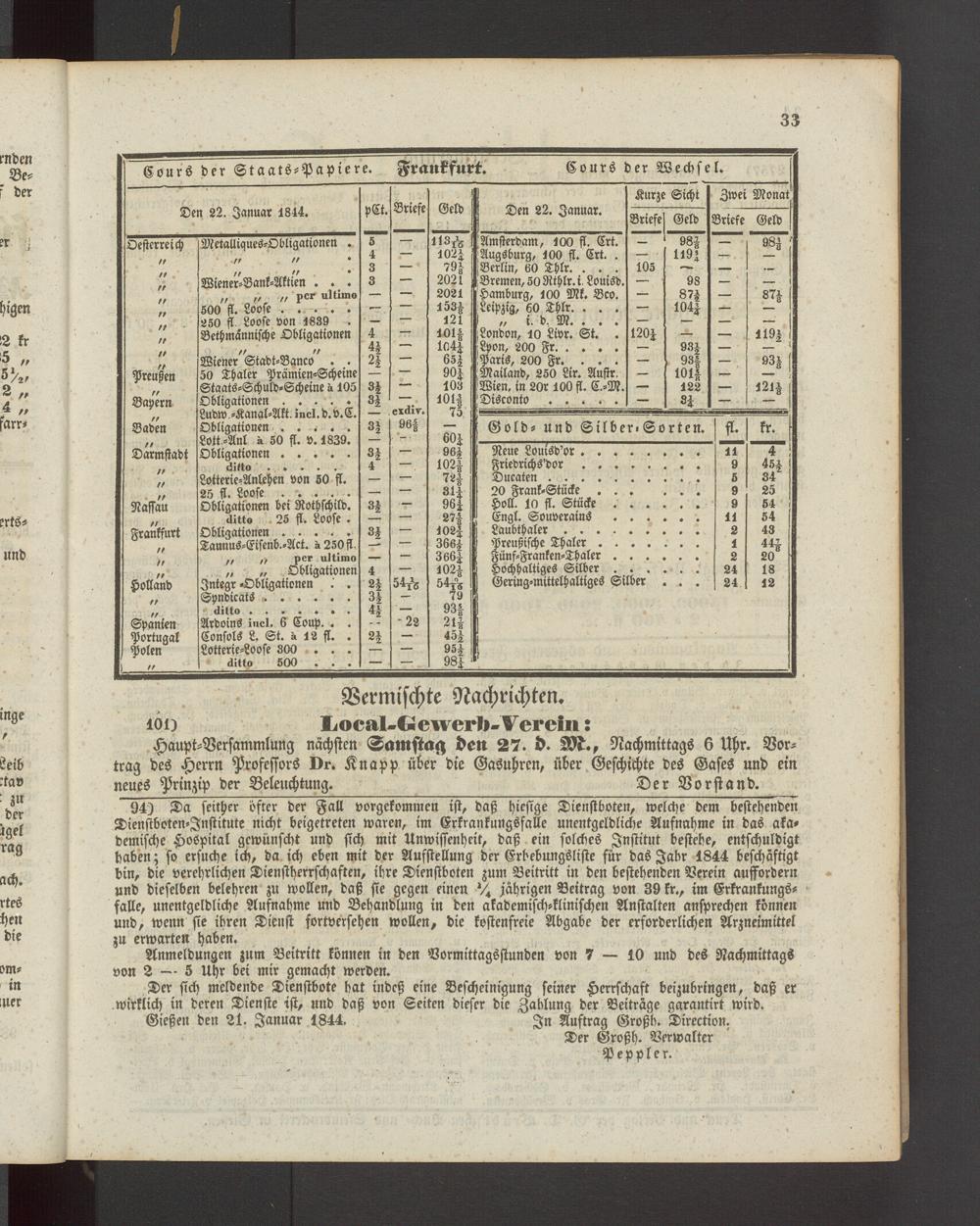 Gießen den 21. Januar 1844. In Auftrag Großh. Direktion.