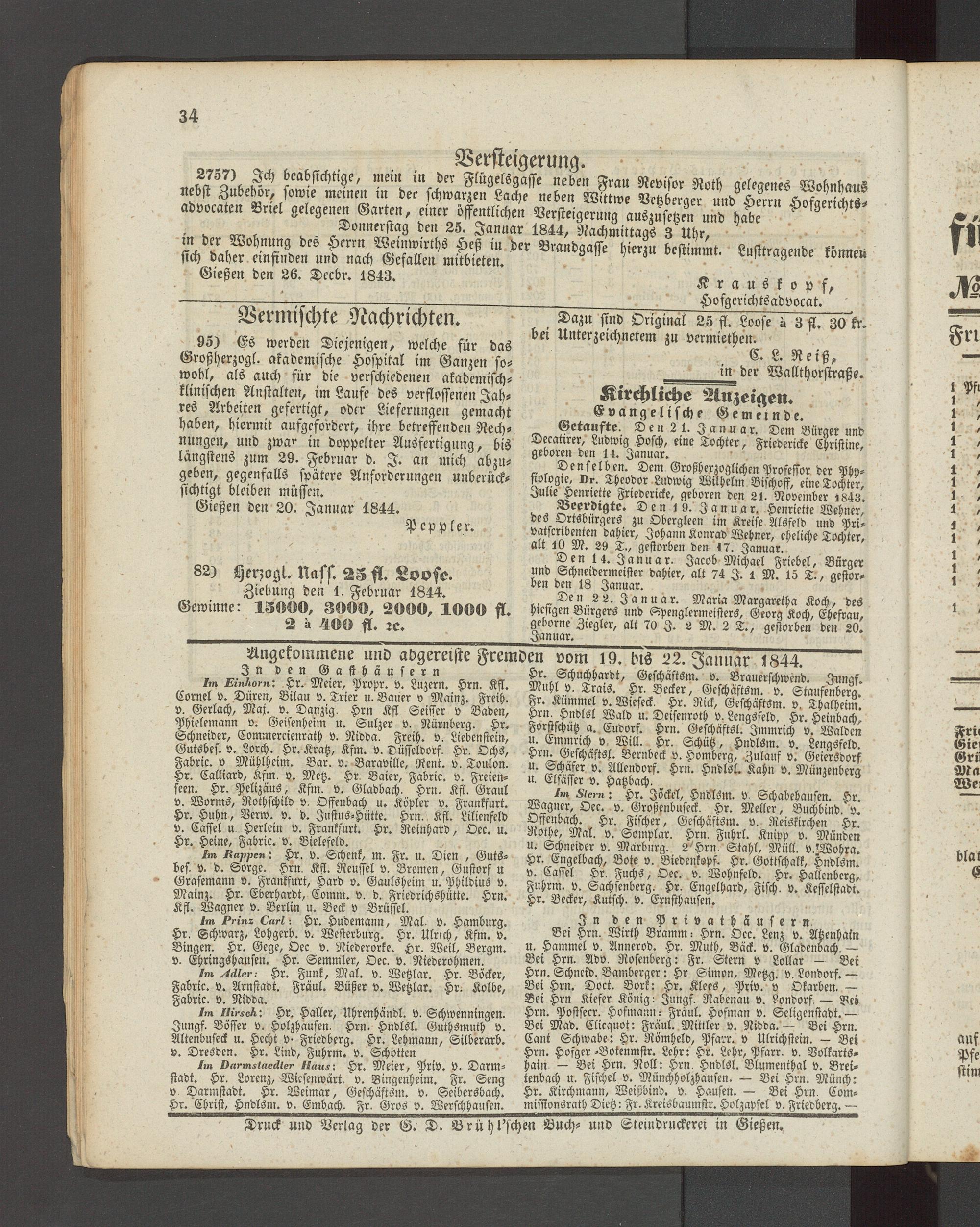 im Hirsch: Hr. Haller, Uhrenhändl. v. Schwenningen. Zungf. Böffer v. Holzhausen. Hrn. Hndlsl. Guthsmuth v. Altenbuseck u. Hecht v- Friedberg. Hr. Lehmann, Silberarb. v. Dresden. Hr. Lind, Fuhrm. v. Schotten