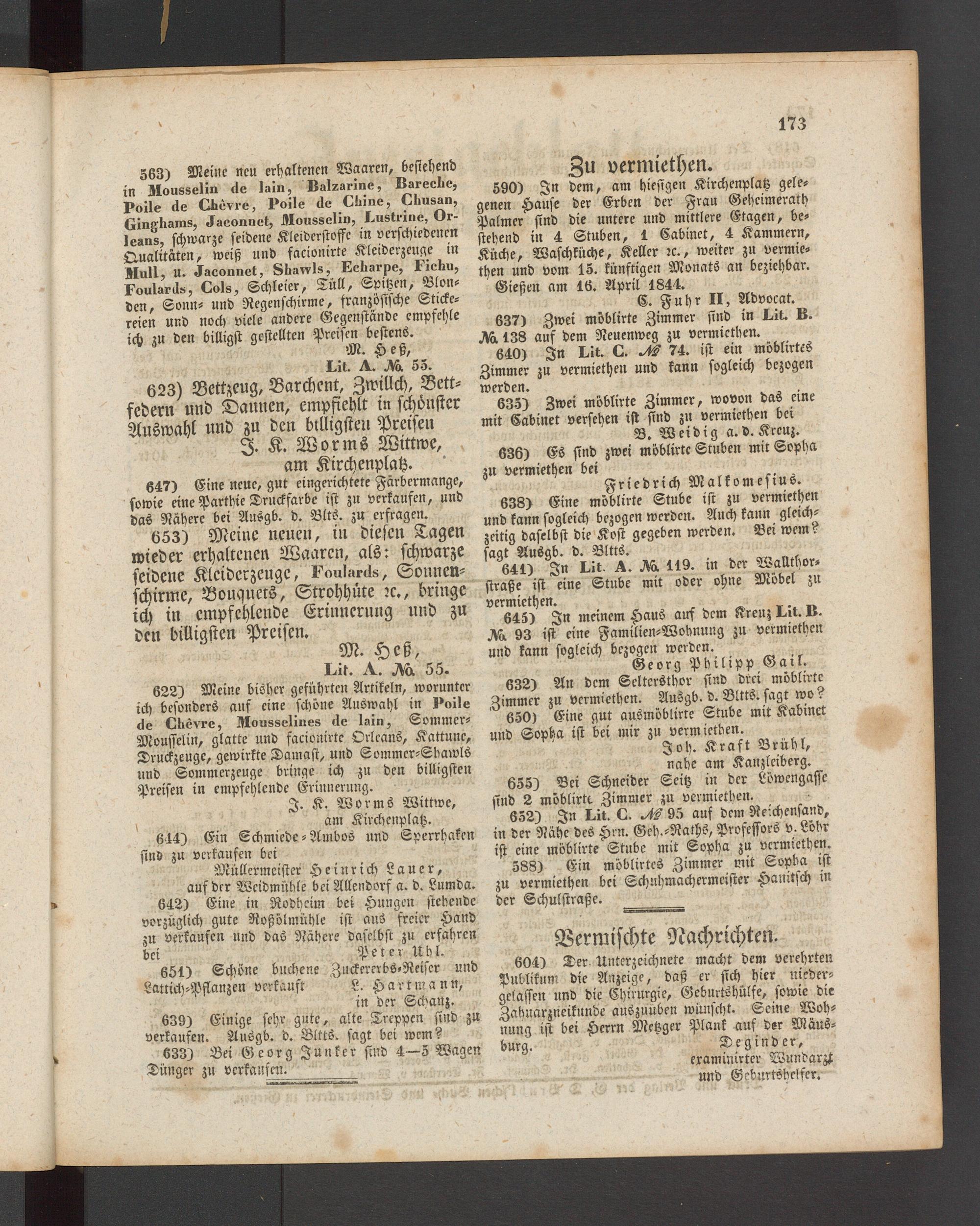 604) Der Unterzeichnete macht dem verehrten Publikum die Anzeige, daß er sich hier niedergelassen und die Chirurgie, Gcburtshülfe, sowie die Zakuarzneikunde auszuüben wünscht. Seine Wohnung ist bei Herrn Metzger Plank auf der Mäus- burg. Deginder,