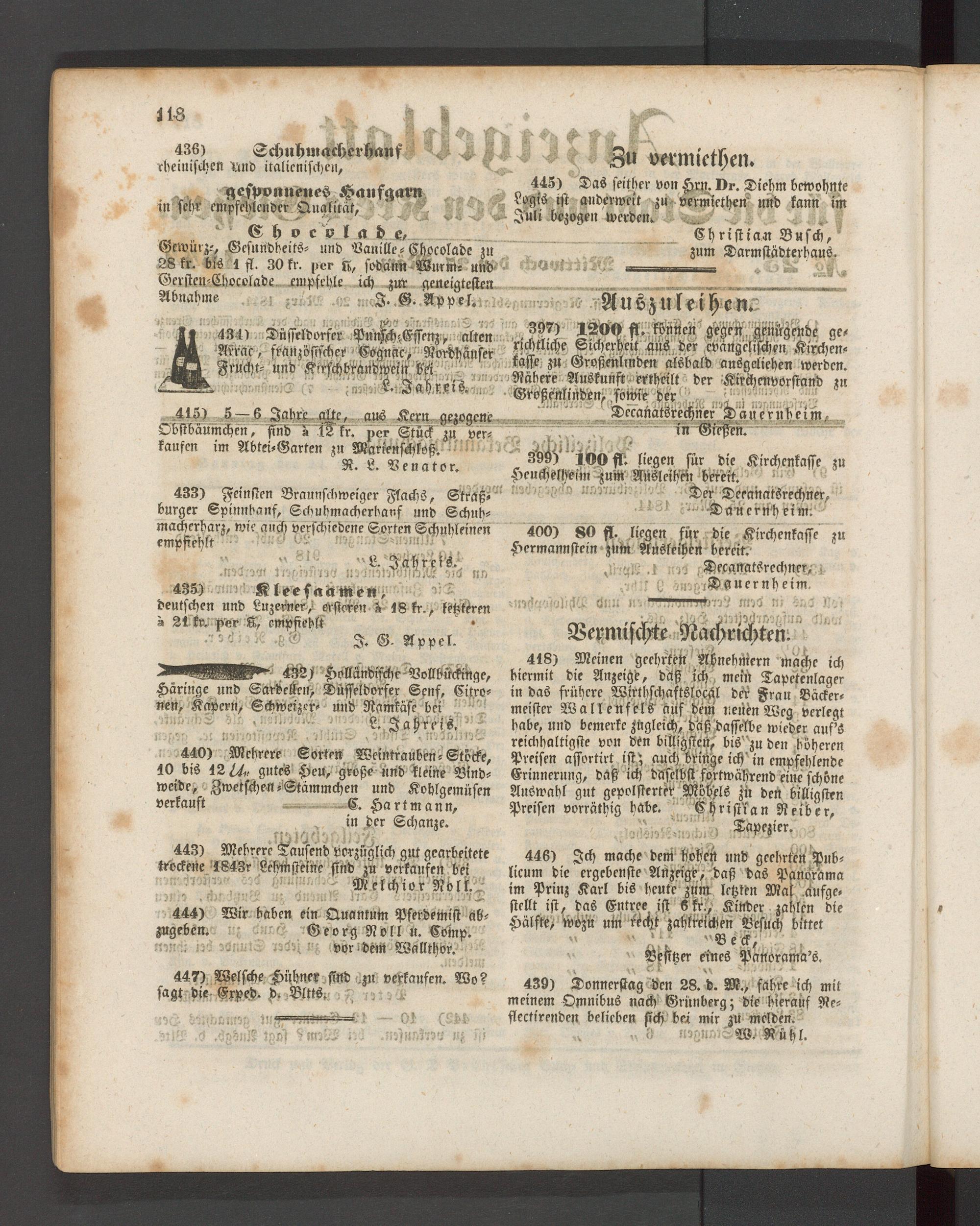 446) Ich mache dem hoben und geehrten Publicum die ergebenste Anzeige, daß das Panorama im Prinz Karl bis heute zum letzten Mal aufge. stellt ist, das Entree ist 6 fr., Kinder zahlen die Hälfte, wozu uin röcht zahlreichen Besuch bittet