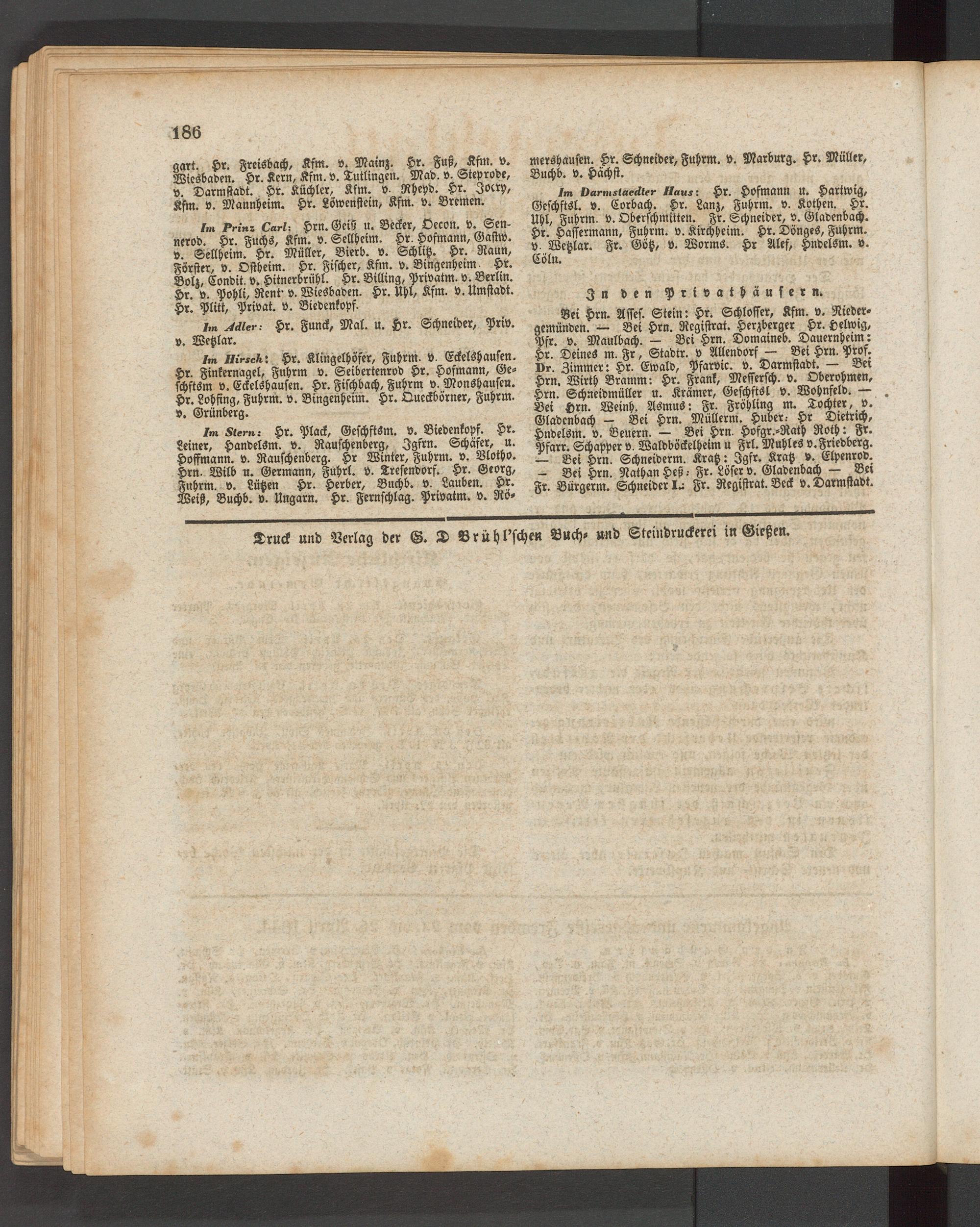 Im Darmstaedler Haus: Hk. HvfMaUN U. Hartwig, Gcschftsl. v. Corbach. Hr. Lanz, Fuhrm. v. Kothen. Hr. Uhl, Fuhrm. v. Obcrschmitten. Fr. Schneider, v. Gladenbach. Hr. Hassermann, Fuhrm. v. Kirchheim. Hr. Dönges, Fuhrm. v. Wetzlar. Fr. Götz, v. Worms. Hr Alef, Hndclsm. v. Cöln.