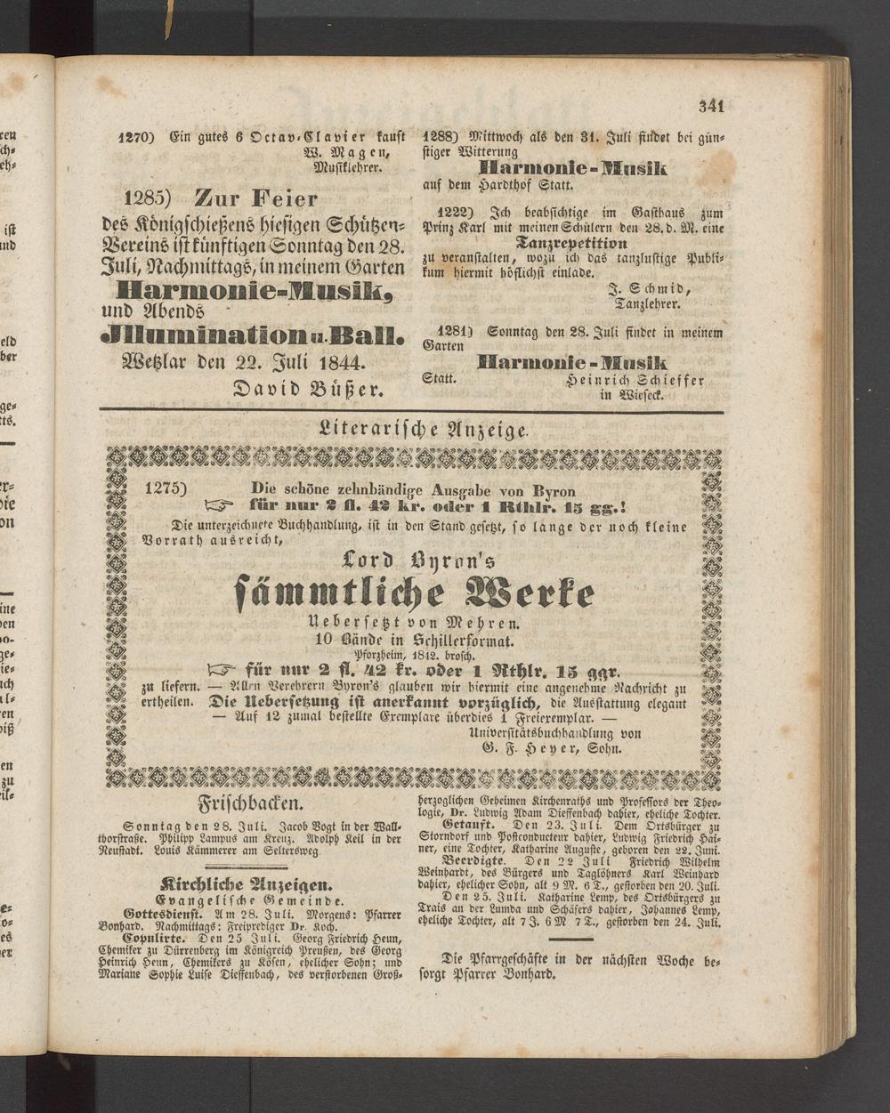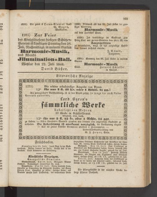 zu liefern. — Allen Verebrern Byron's glauben wir hiermit eine angenehme Nachricht zu ertheilen. Die Uebersetzung ifi anerkannt vorzüglich, die Ausstattung elegant — Auf 12 zumal bestellte Exemplare überdies 1 Freiexemplar. — Univcrsitätsbuchhandlung von G. F. Heyer, Sohn.