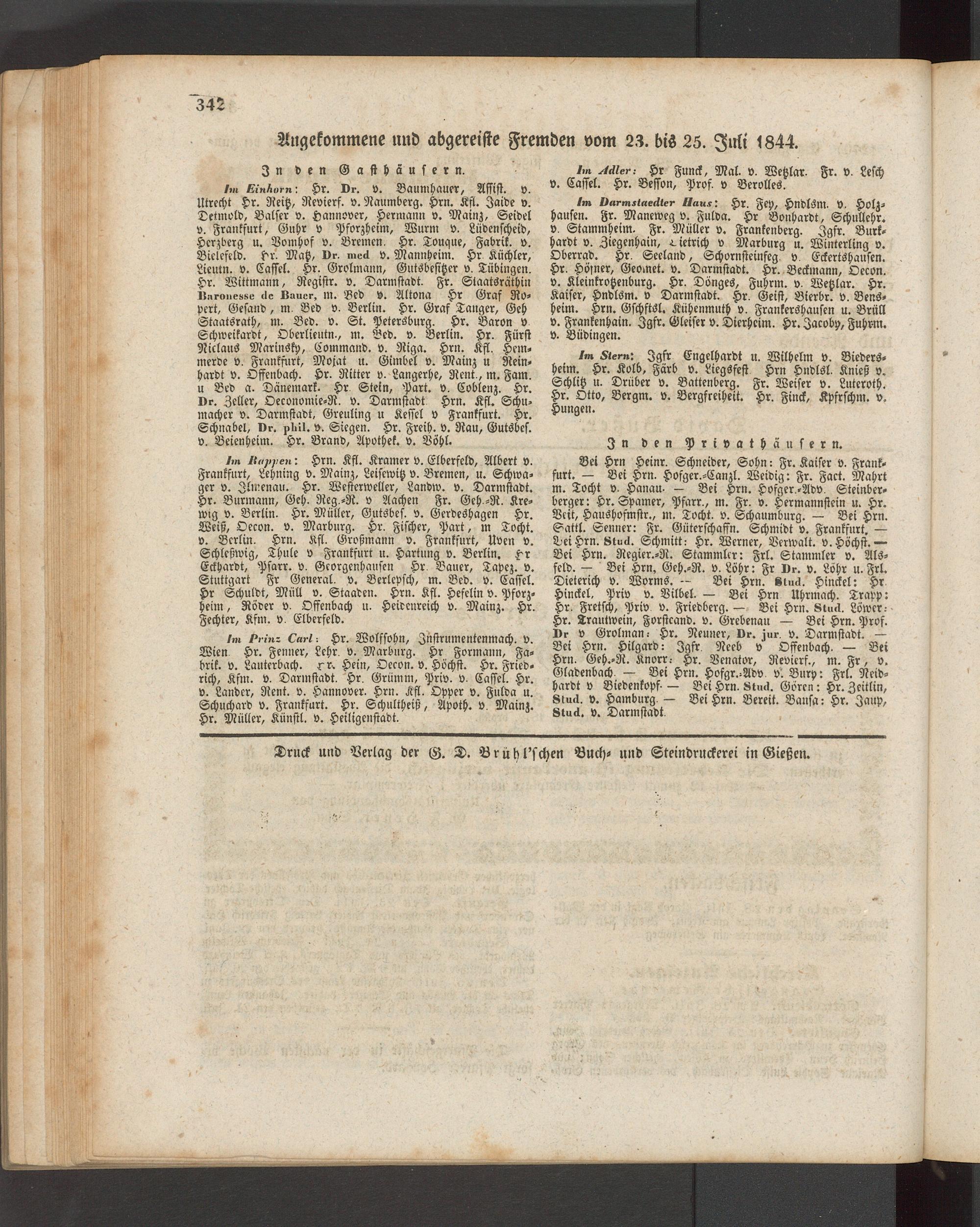 Im Adler: Hr Funck, Mal. v. Wetzlar. Fr. v. Lcsch v. Cassel. Hr. Besson, Prof, v Berolles.