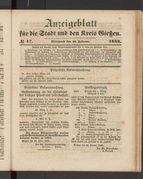 1) Verordnung, das Aufsuchen von Waarenbestcllungen durch Handelsreisende betr ; — 2) Bekanntmachung, die Hauptresultate der Rechnung der Stellvertretungs - Assecucanzkaffe von dem Musterungs - und Ziehungsjahr 1842 betr.; — 3) Umlagen zur Bestreitung der Bedürfnisse der israelitischen Religionsgemeinden des Kreises Hungen für 1844; — 4) Gemeinde-Umlagen im Kreise Dieburg für das Jahr 1844 ; — 5) Umlagen in den Gemeinden des Kreises Darmstadt für das Jahr 1844; — 6) Desgl. in den Gemeinden des Kreises Nidda für das Jahr 1844;— Desgl. der israelitischen Religionsgemeinden des Kreises Heppenheim für das Jahr 1844; — 8) Namensveränderungen; — 9) Dienstnachrichten; — 10) Characterertheilungen; — 11) Versetzung in den Ruhestand; — 18) Concurrenzeröffnungen; — 13) Kterbfälle.