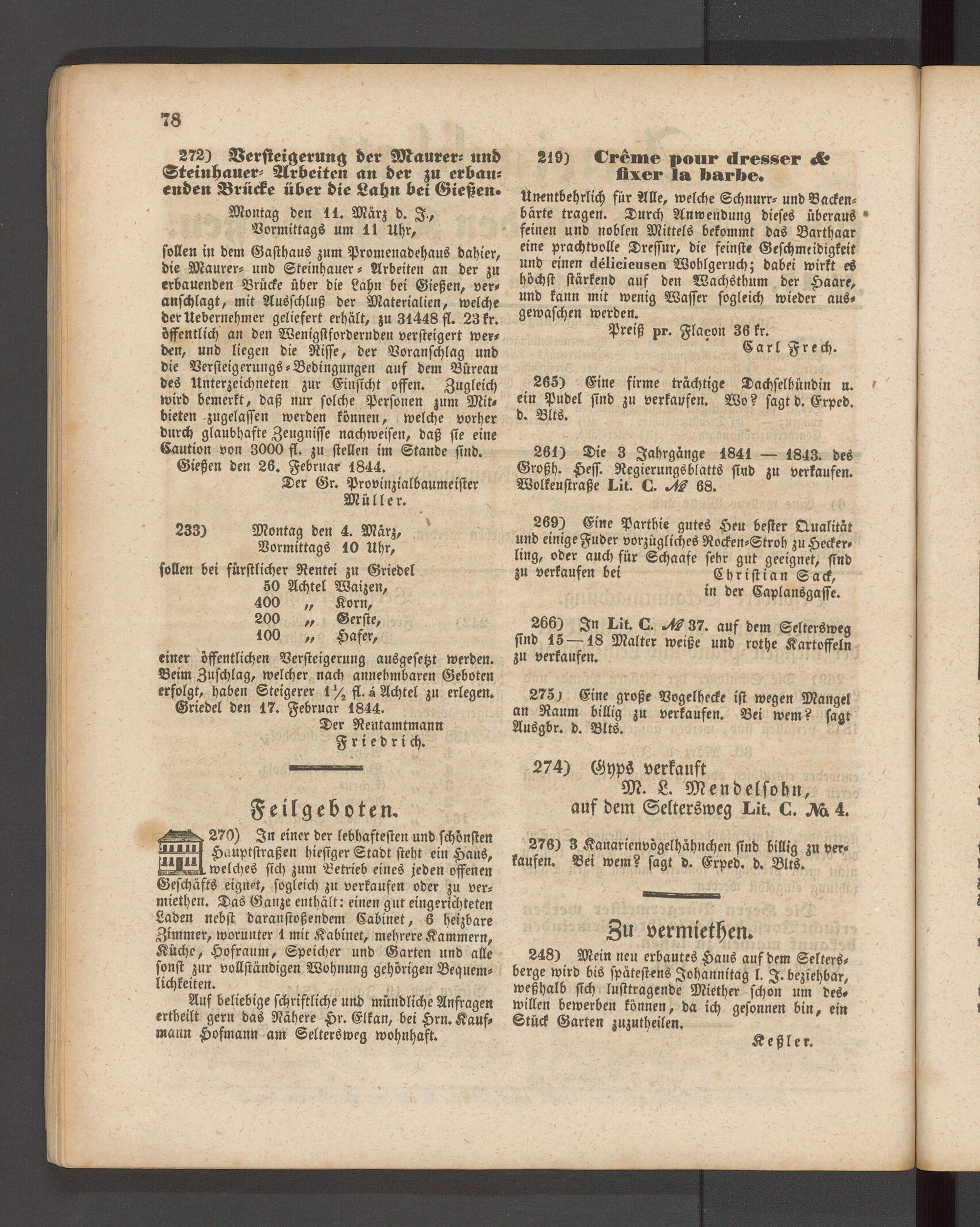 einer öffentlichen Versteigerung ausgesetzt werden. Beim Zuschlag, welcher nach annehmbaren Geboten erfolgt, haben Steigerer 1 % fl. ä Achtel zu erlegen. Griedel den 17. Februar 1844.