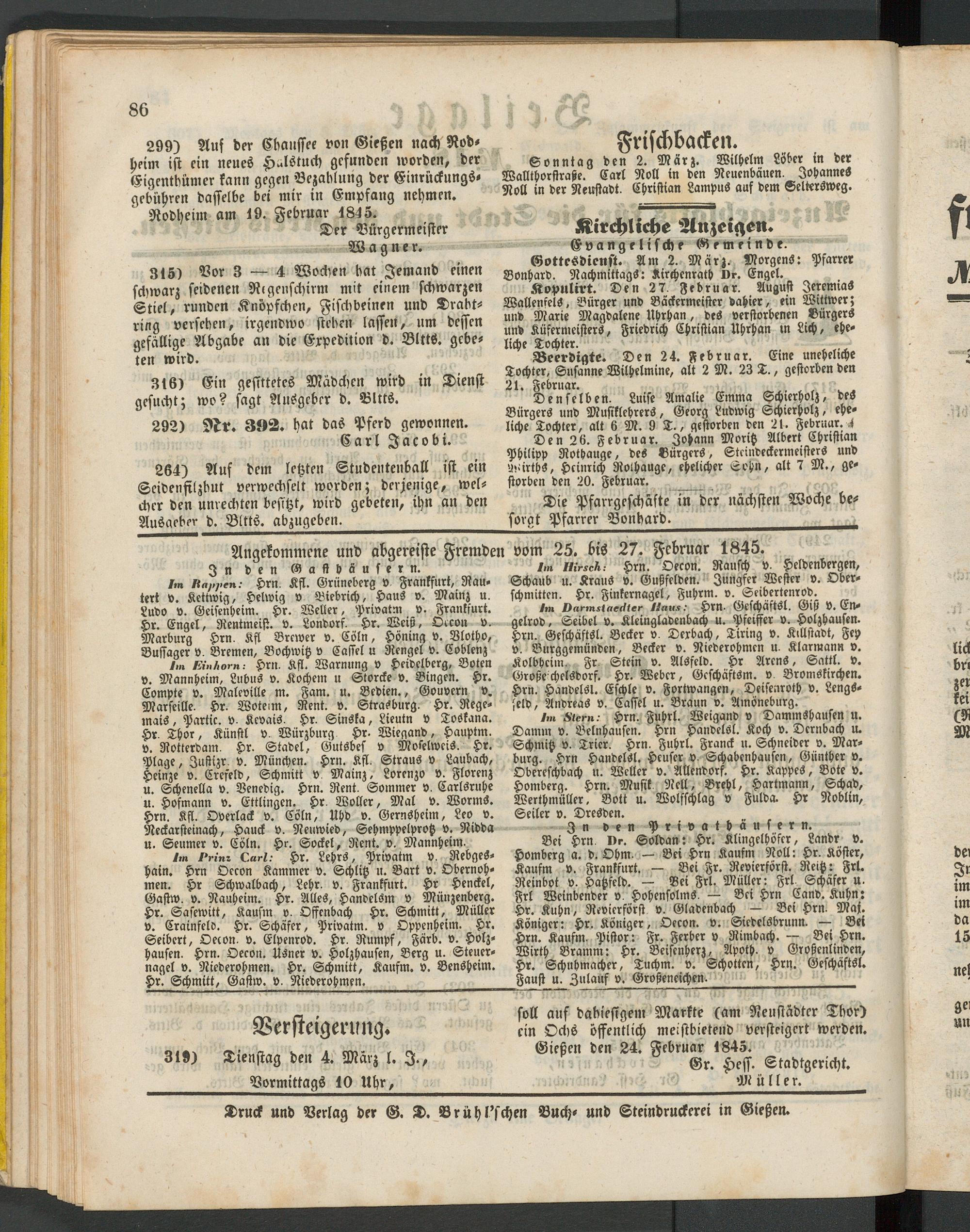 299) Auf der Chaussee von Gießen nach Rod- Heim ist ein neues Halstuch gefunden worden, der Eigentbümer kann gegen Bezahlung der Einrückungs- gebühren dasselbe bei mir in Empfang nehmen.