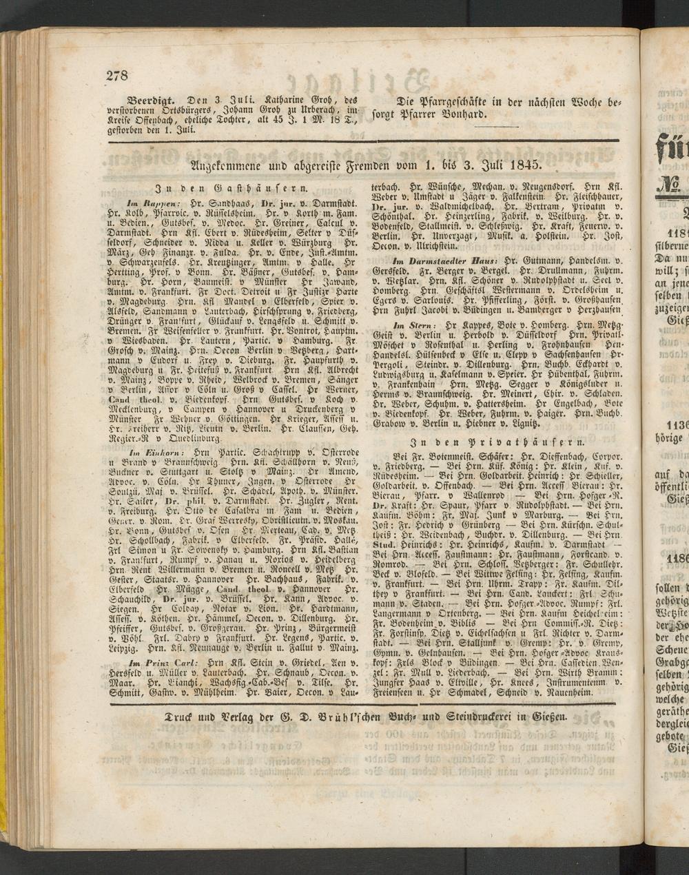 Im Darmstaedter Haus: Hr. GutmailN, HandklSM. v. Gersfeld. Fr. Berger v. Lergel. Hr. Drullmann, Fuhrm. v. Wetzlar. Hrn. Kfl. Schöner v. Rudotphstadt u. Seel v. Homberg. Hrn. Geschäfts! Westermann v. Ordclshcim n. Egers v. Sarlouis. Hr. Pfifferling, Först, v. Großhausen. Hrn Fuhrt Jacobi v. Büdingen u. Bamberger v Herzhausen