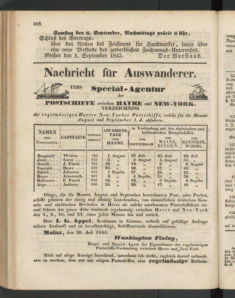 Herr 1. <*. Appel , Kaufmann in Giessen, ertheilt auf gefällige Anfrage nähere Auskunft und ist bevollmächtigt, Schiffsaccorde abzuschliessen.
