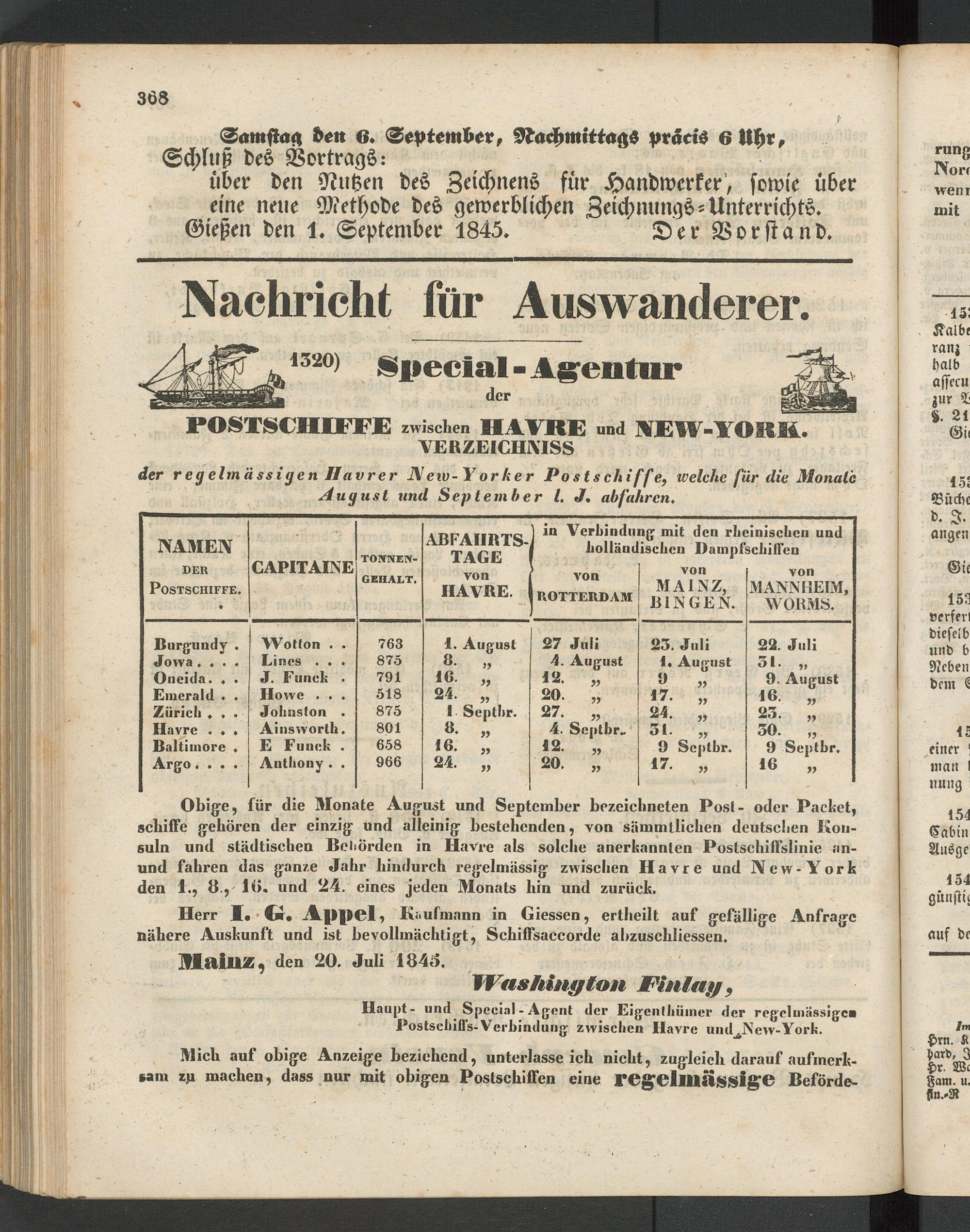 Obige, für die Monate August und September bezeichneten Post - oder Packet, schiffe gehören der einzig und alleinig bestehenden, von sämmtlichen deutschen Konsuln und städtischen Behörden in Havre als solche anerkannten Postschiffslinie an- und fahren das ganze Jahr hindurch regelmässig zwischen Havre und New-York den 1., 8 , Hi. und 24. eines jeden Monats hin und zurück.